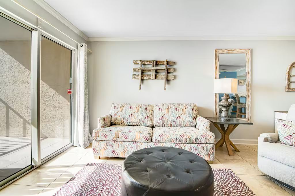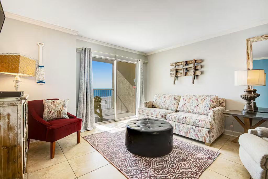 Clearwater 2C Living area with Gulf views and a pull-out sofa for extra sleeping space.