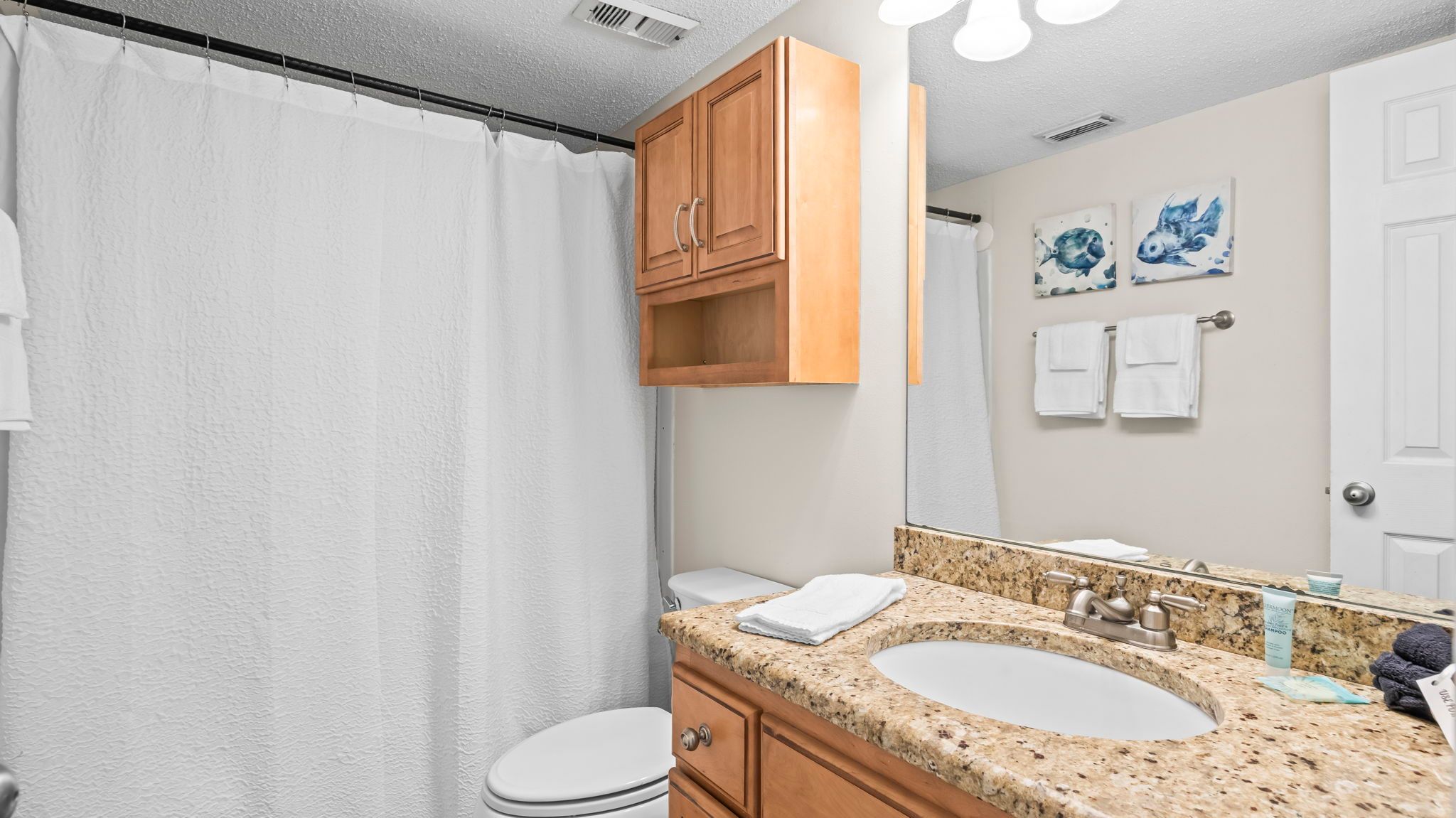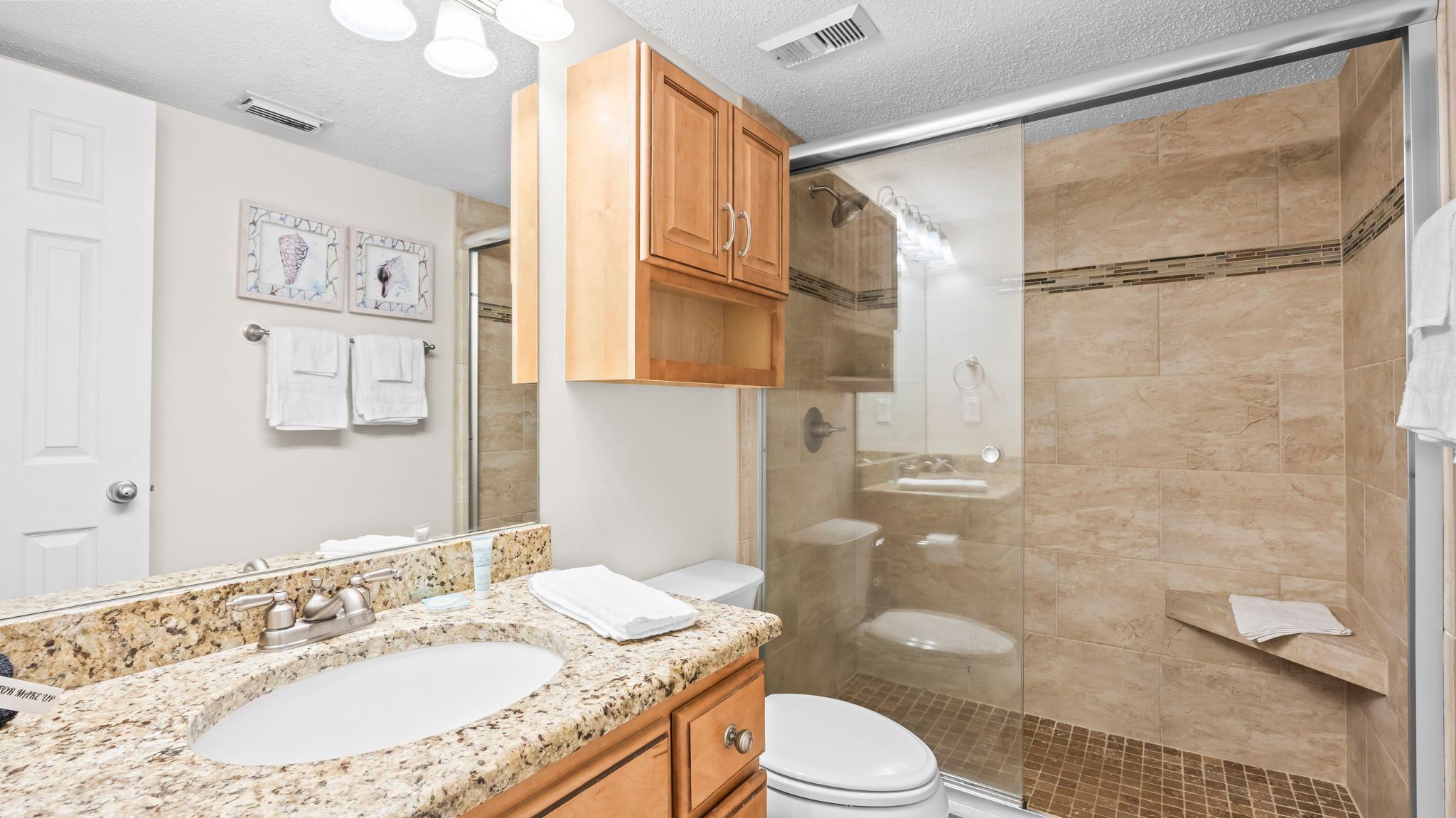 * Two full bathrooms, including one with a tiled walk-in shower, provide added comfort and convenience for your group.