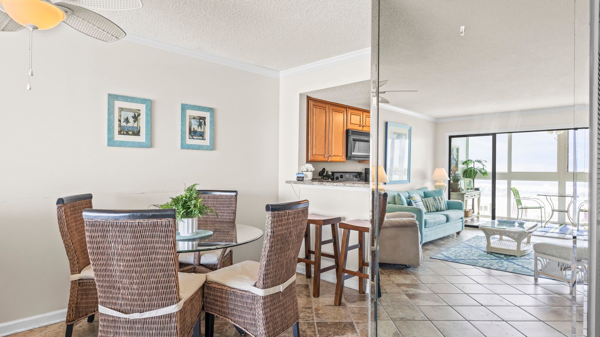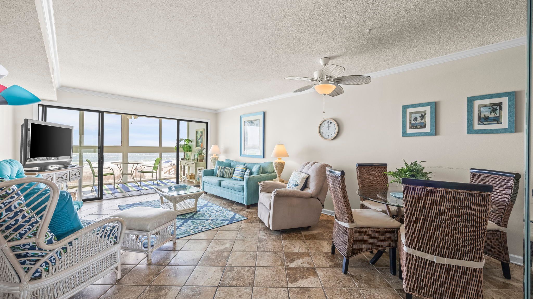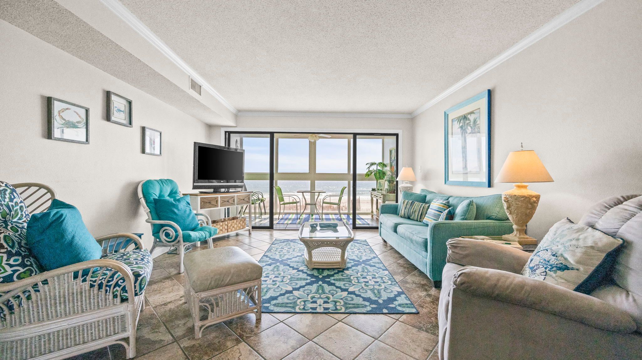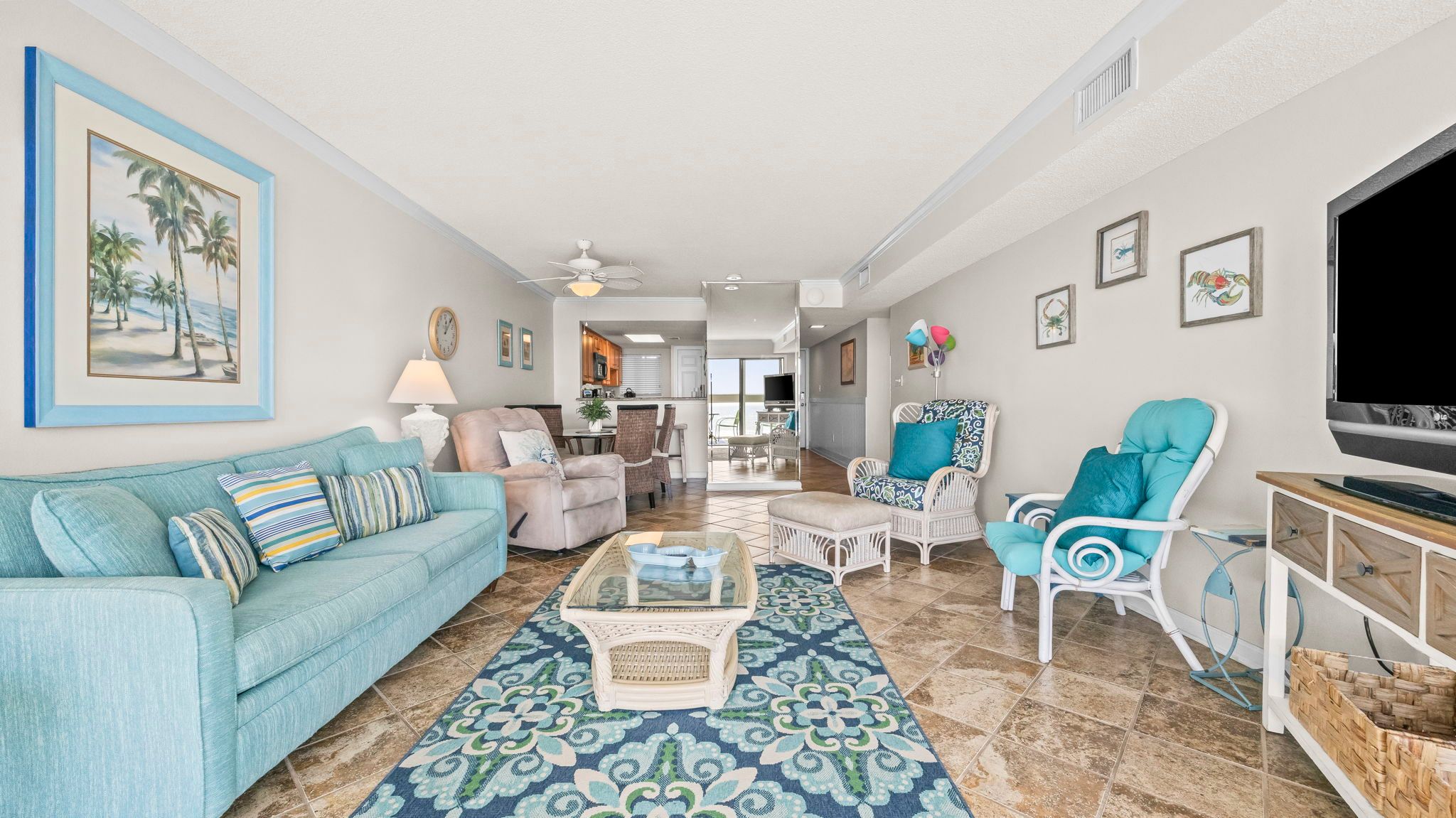 With approximately 1,100 square feet, this 2 bedroom, 2 bathroom condo comfortably sleeps six while maintaining an open, airy feel. The layout flows easily from kitchen to dining to living area, all positioned to take full advantage of the view.