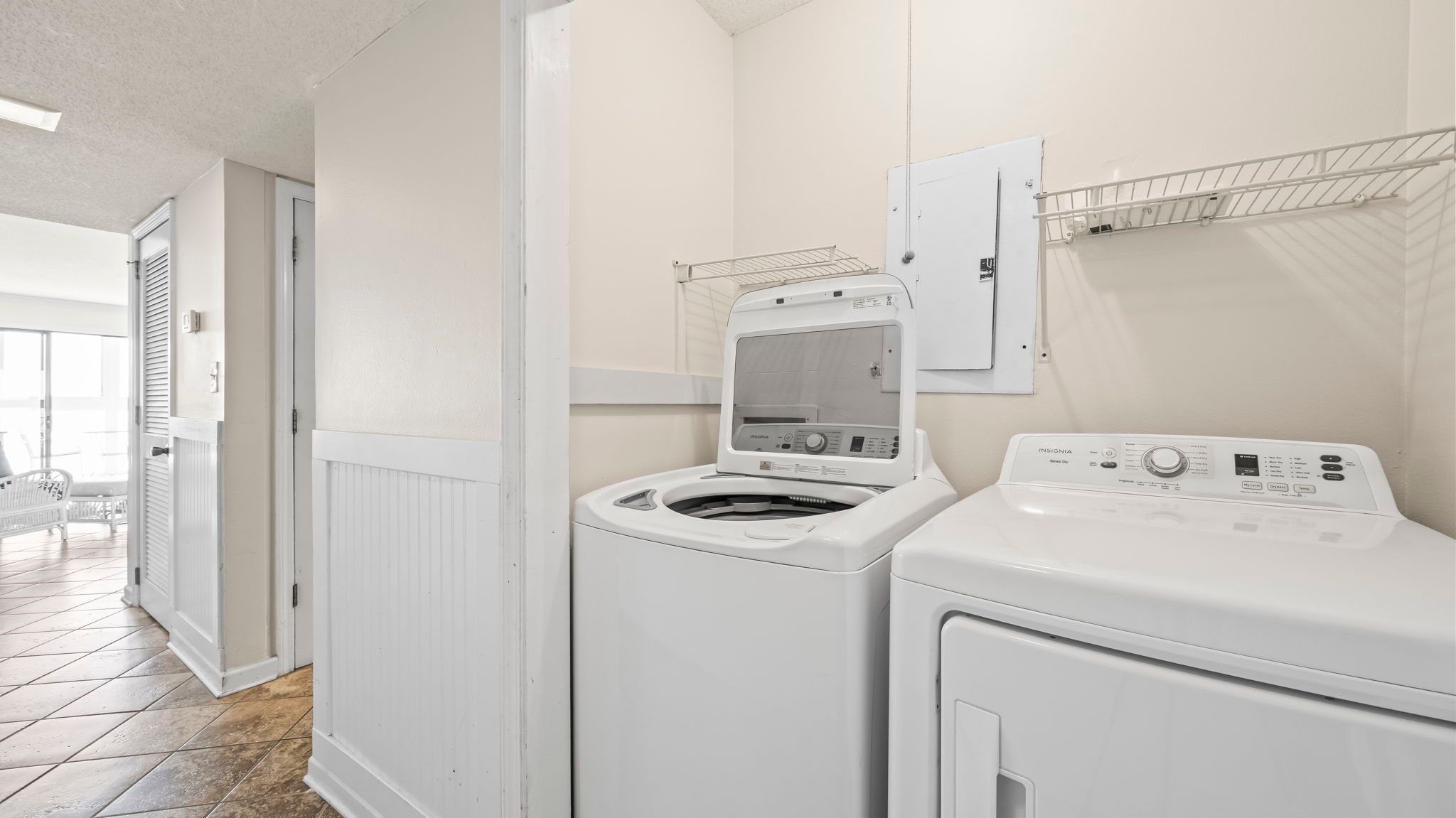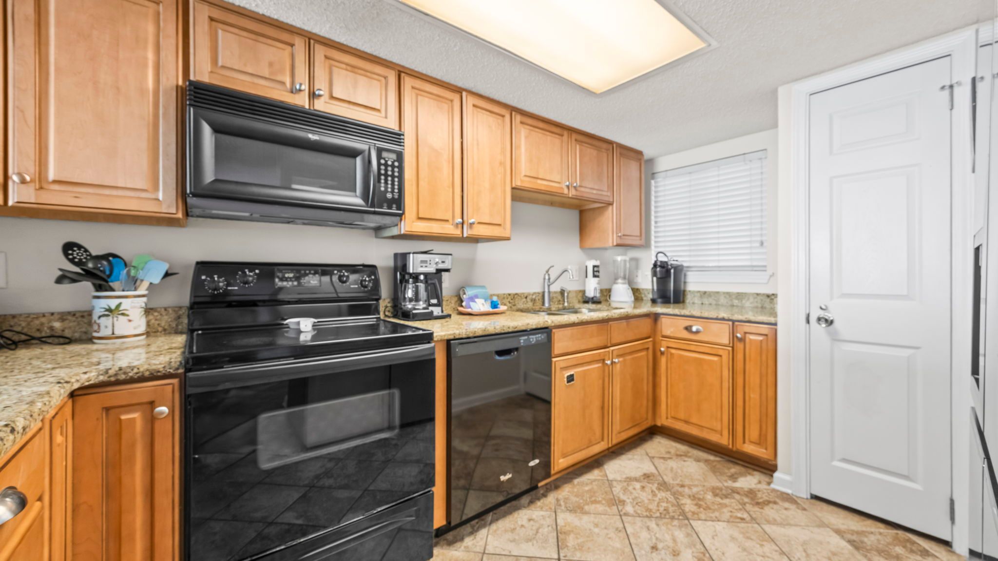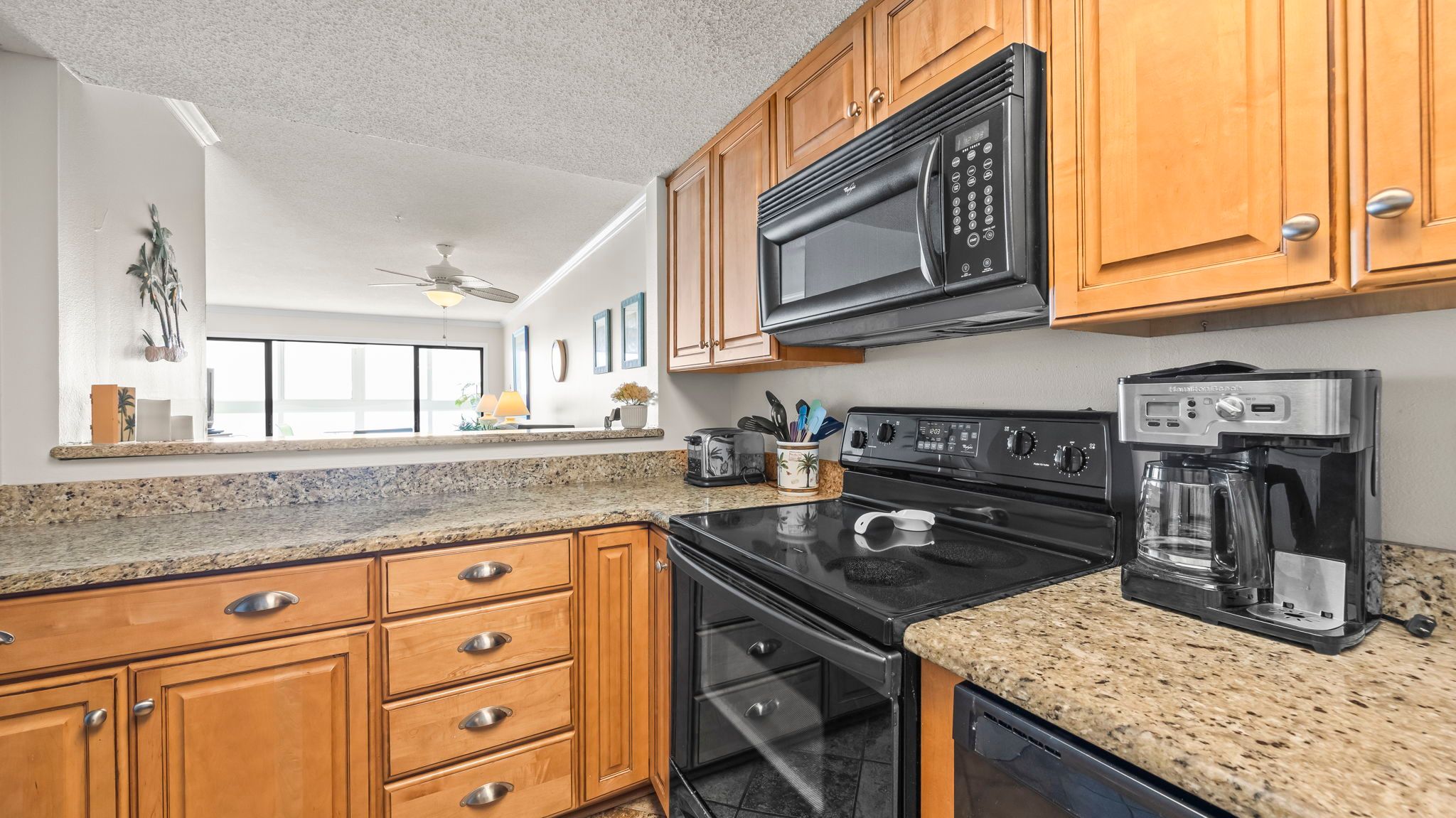 The kitchen is fully equipped with everything needed for meals at home, including a coffee maker and toaster. A full-size washer and dryer add everyday convenience, especially after long beach days.