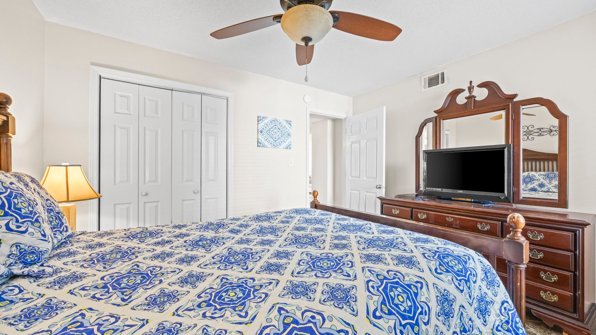 Primary Bedroom: 1 King bed, TV, en suite bathroom.
