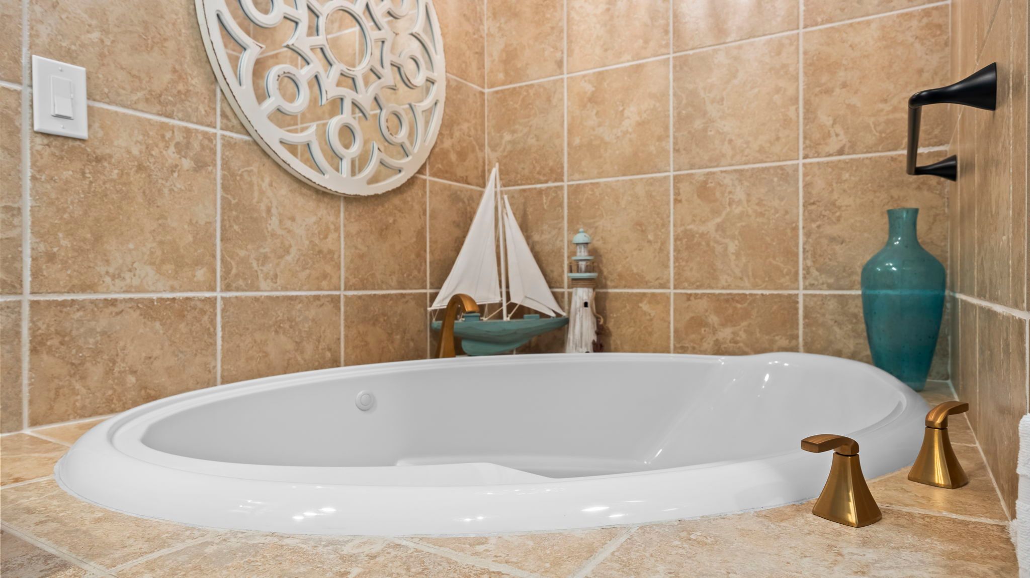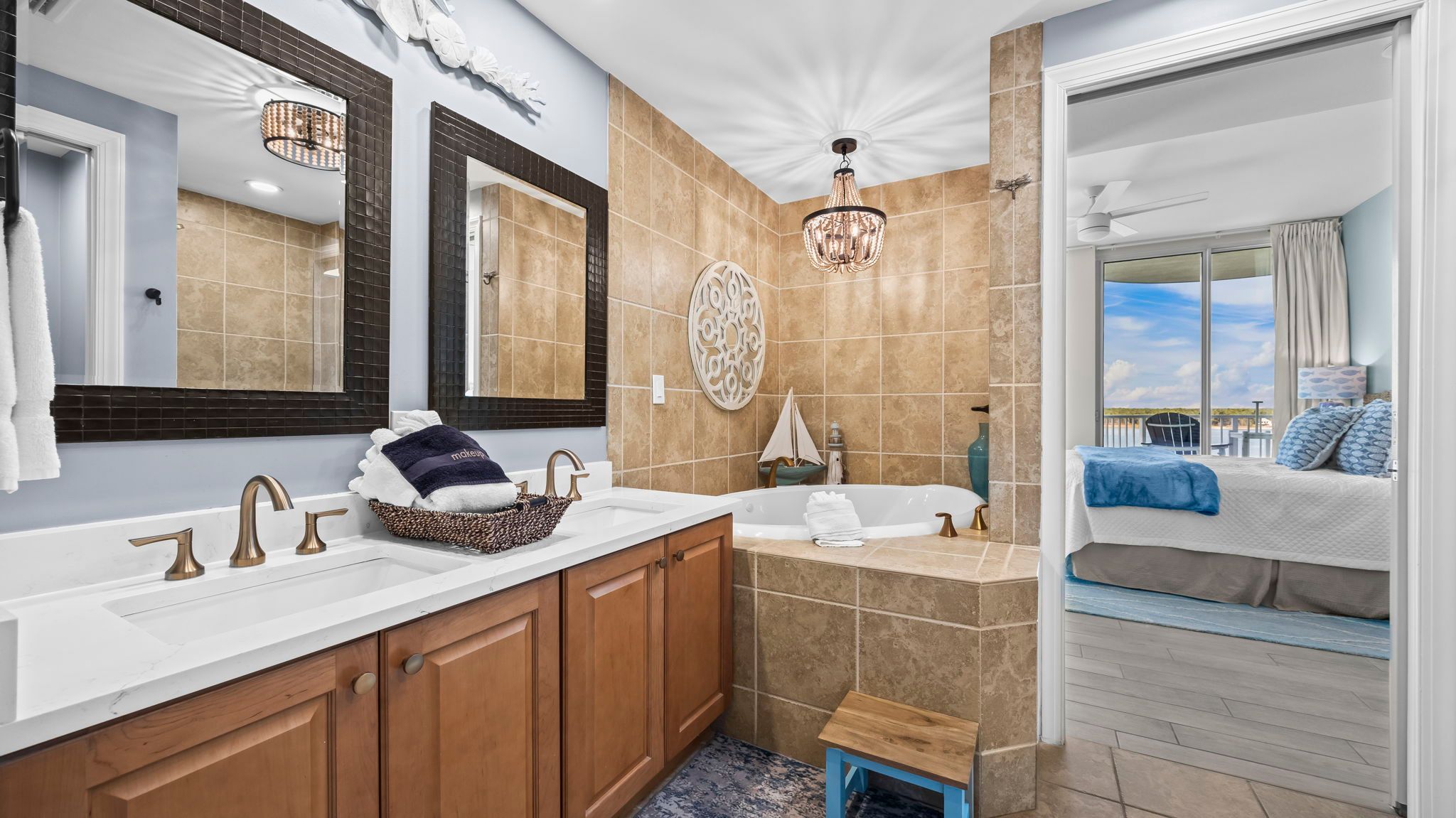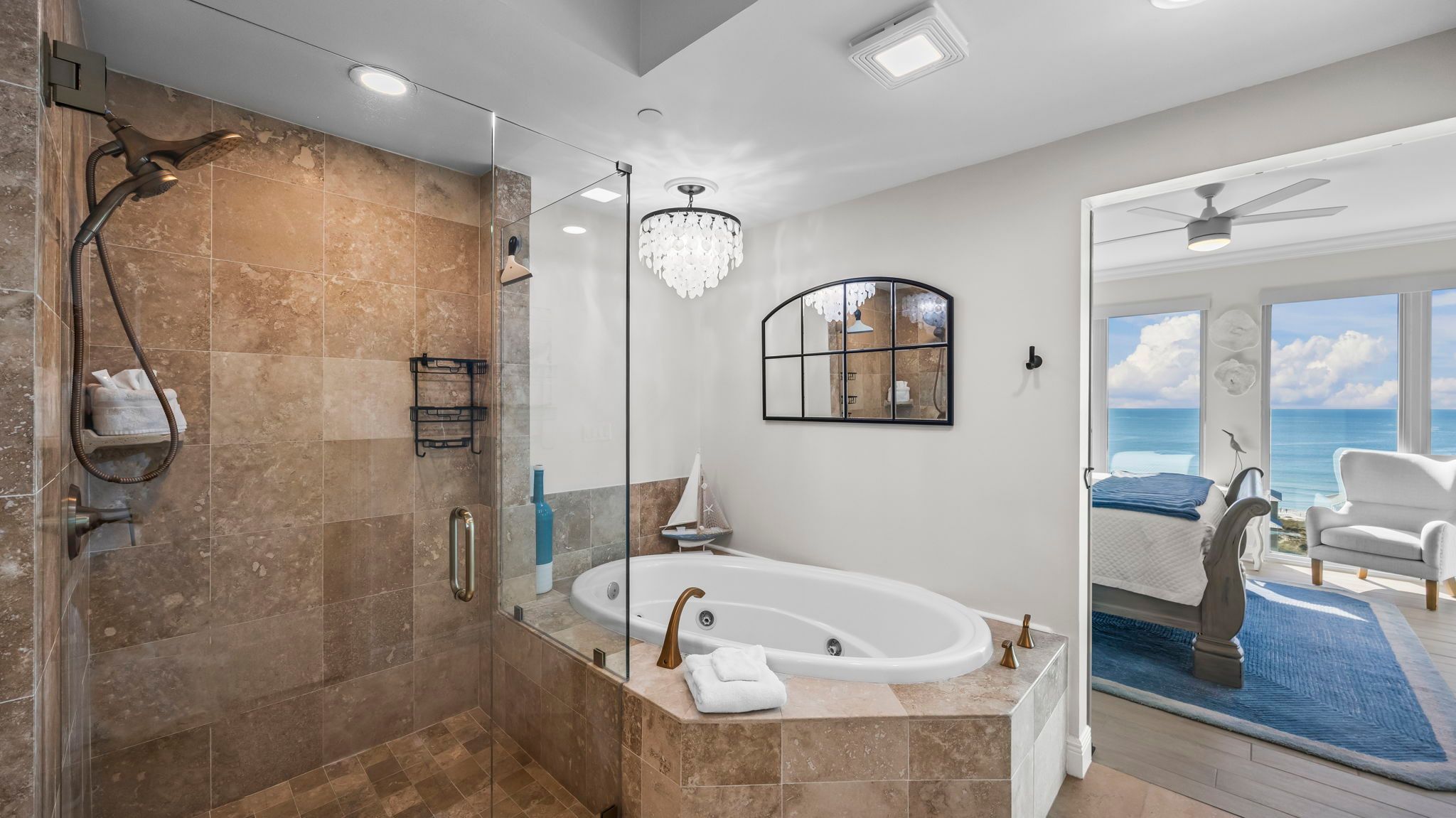 Mustique 801 Primary Bathroom featuring a jetted tub and walk-in shower for a relaxing, spa-like experience.