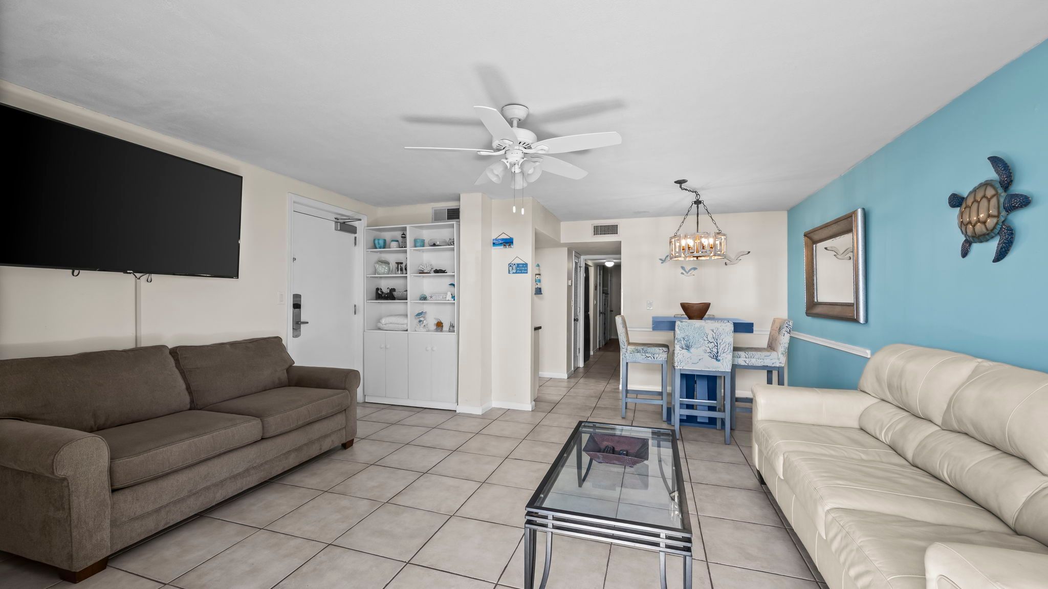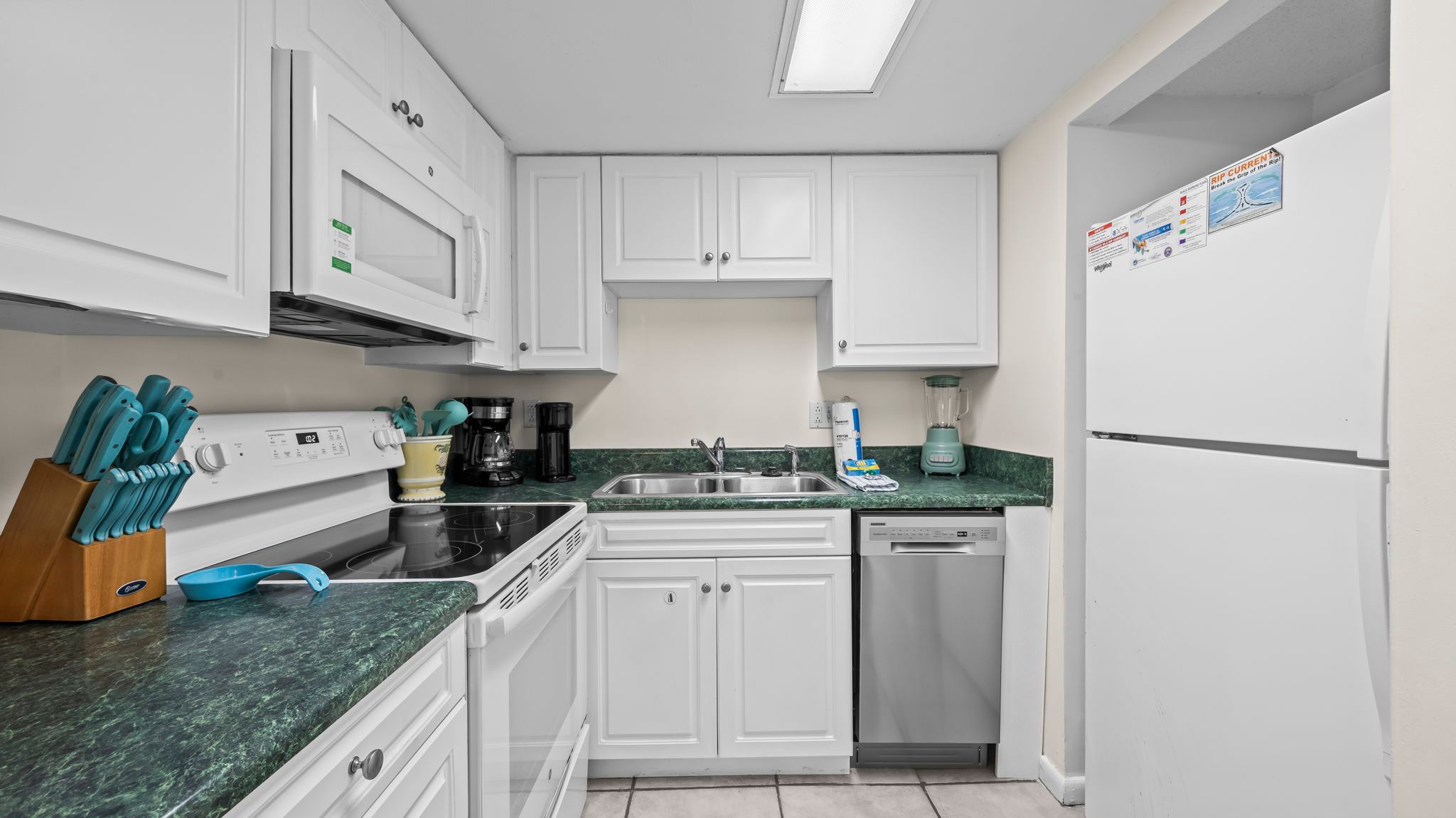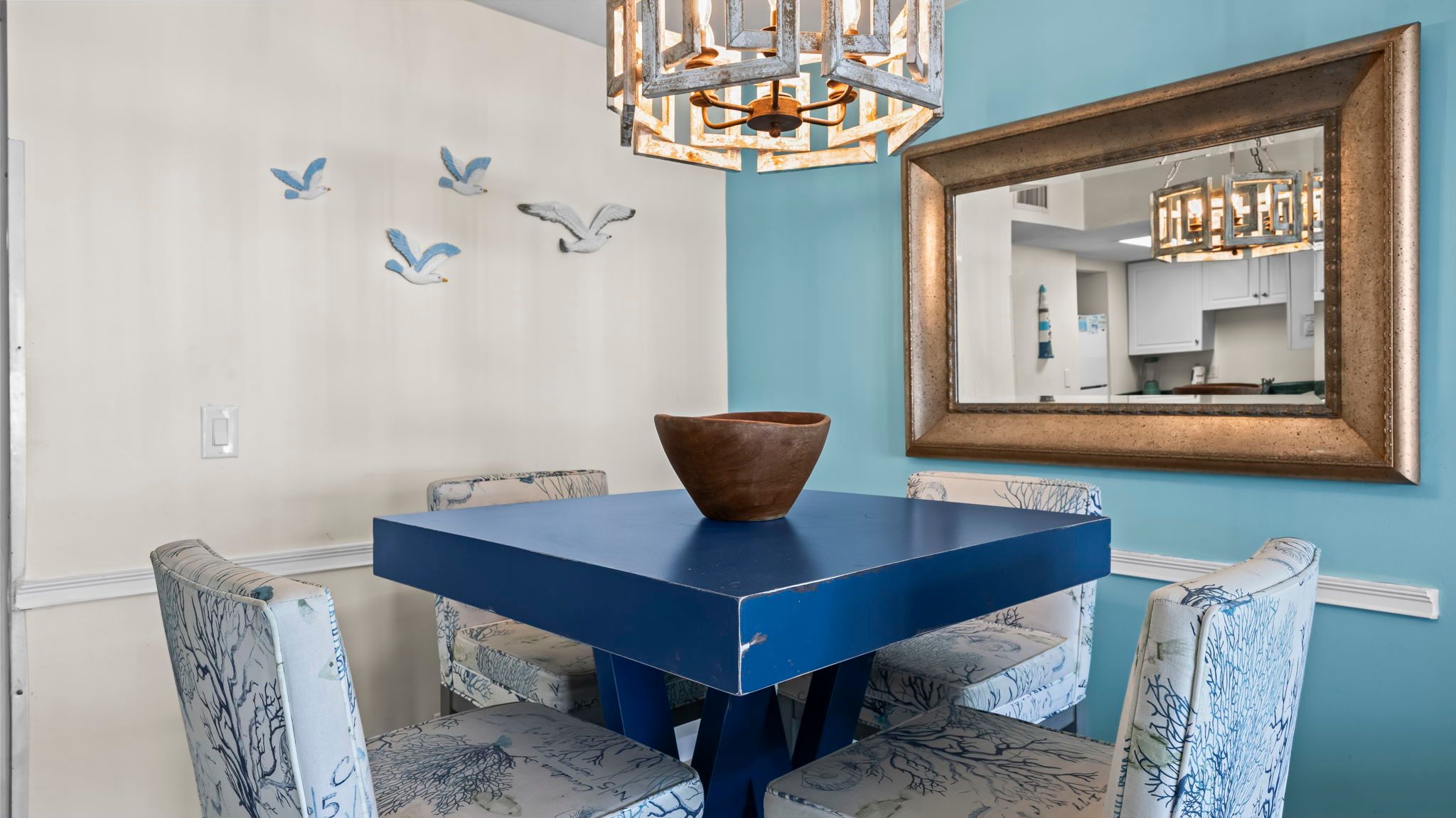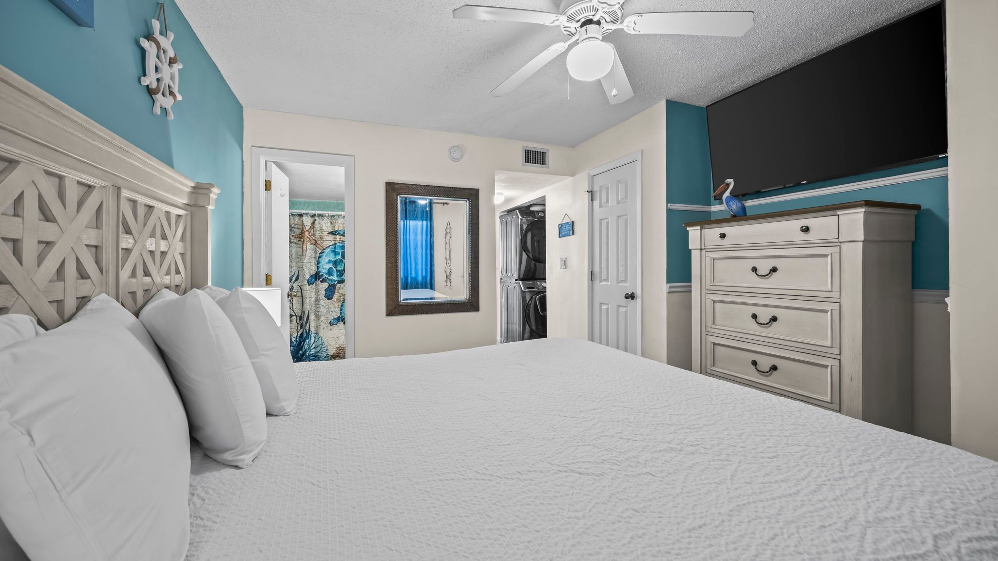 The fully equipped kitchen includes a microwave, coffee maker, blender, and oven, perfect for preparing meals with fresh ingredients from nearby farmers’ markets or local seafood shops. Share your creations at the dining table for four, or enjoy a casual snack while taking in the beach views. A hallway half bathroom and in-unit washer and dryer make your stay convenient and hassle-free.