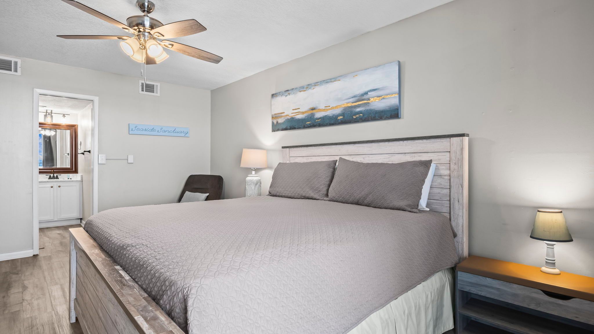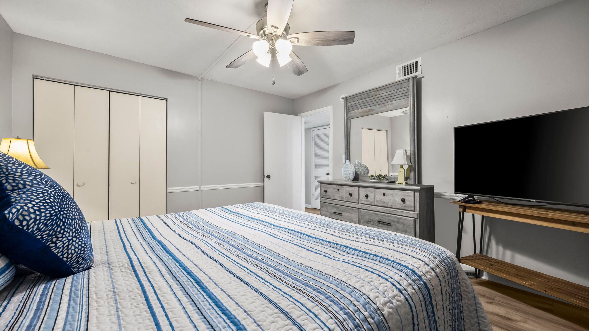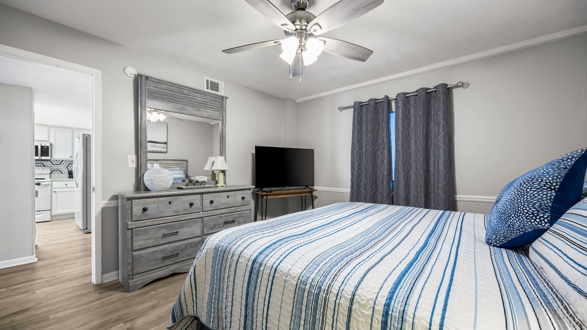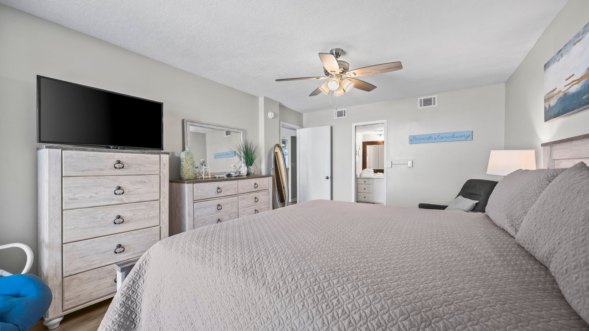 Primary Bedroom: King bed, TV, direct balcony access, ensuite bathroom