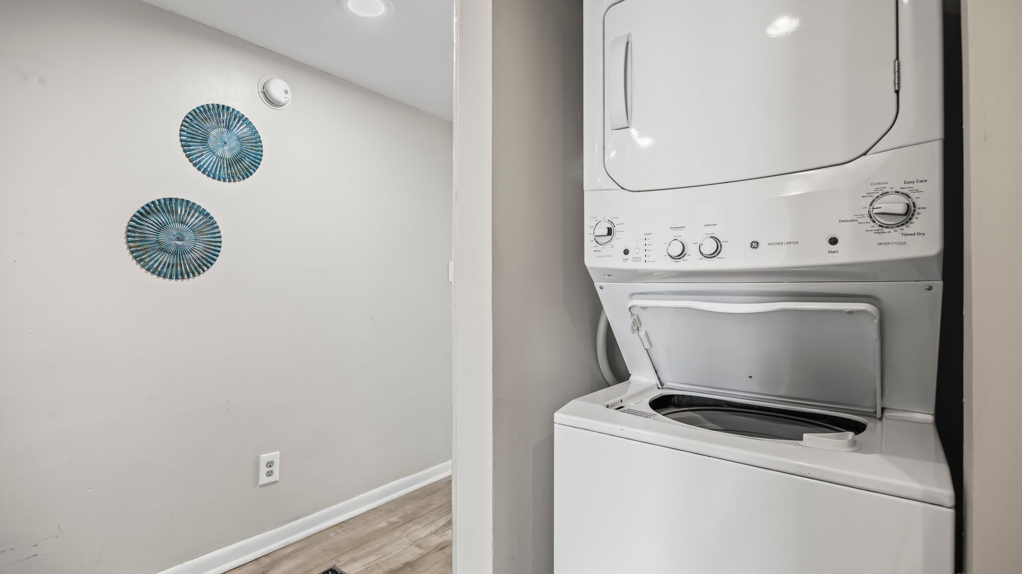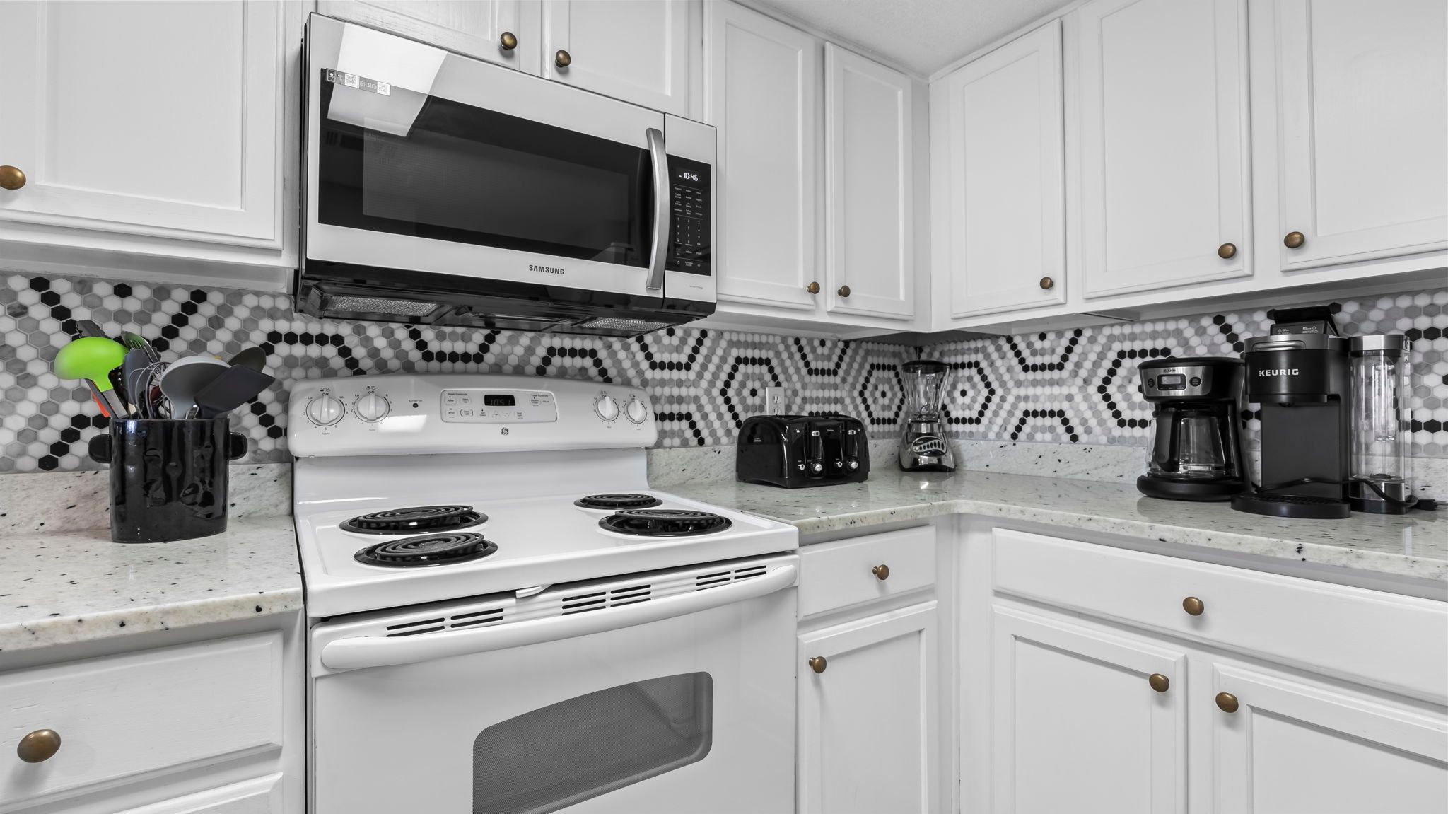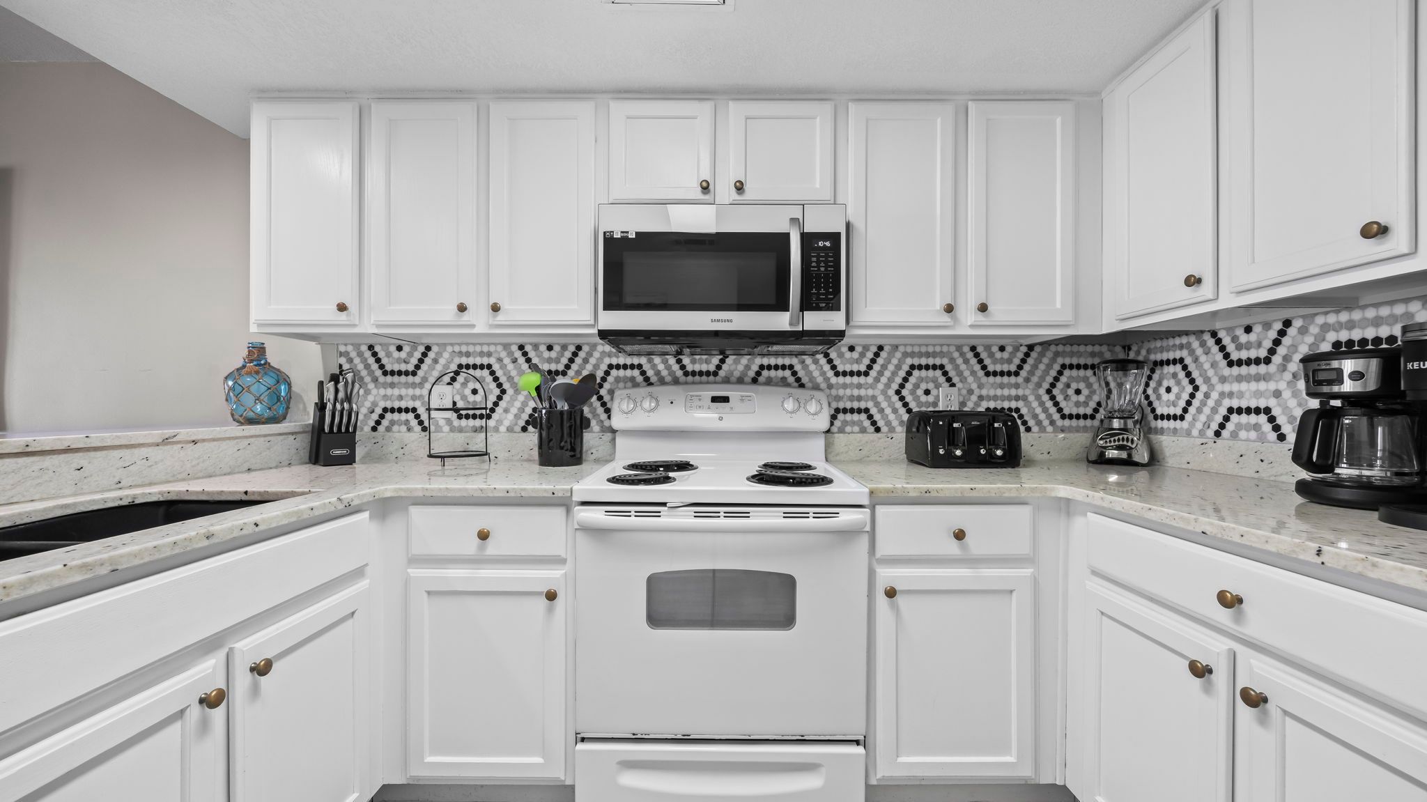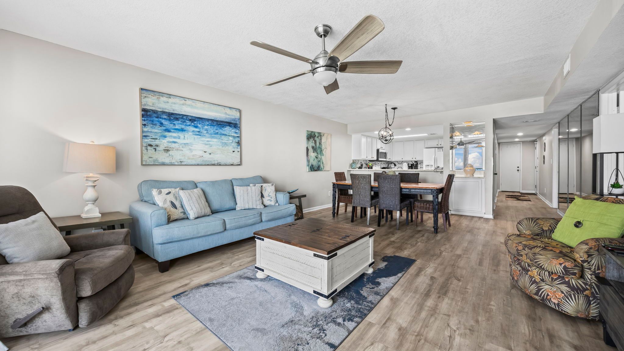 Inside, the open-concept living space invites you to relax while enjoying the Gulf views. Watch your favorite shows on the TV from the cozy sofa, which converts into a queen sleeper for extra guests. The covered balcony offers the ideal spot for morning coffee while listening to the waves or for an evening outdoor dinner under the stars. The fully equipped kitchen includes a Keurig, coffee maker, toaster, blender, and full-size refrigerator with ice maker, perfect for preparing meals with local ingredients from nearby markets. Gather around the dining table for six or enjoy a quick snack at the eat-in counter with two bar stools. A washer and dryer add convenience for longer stays.