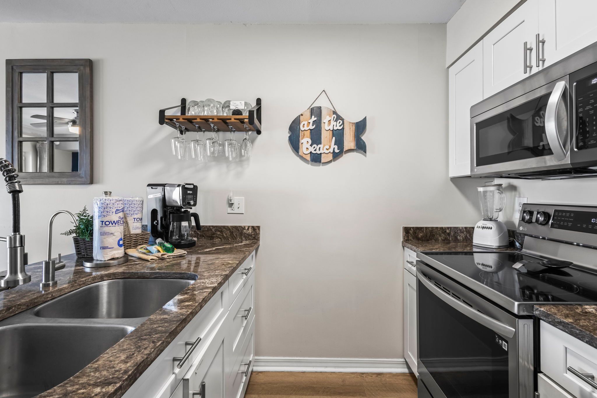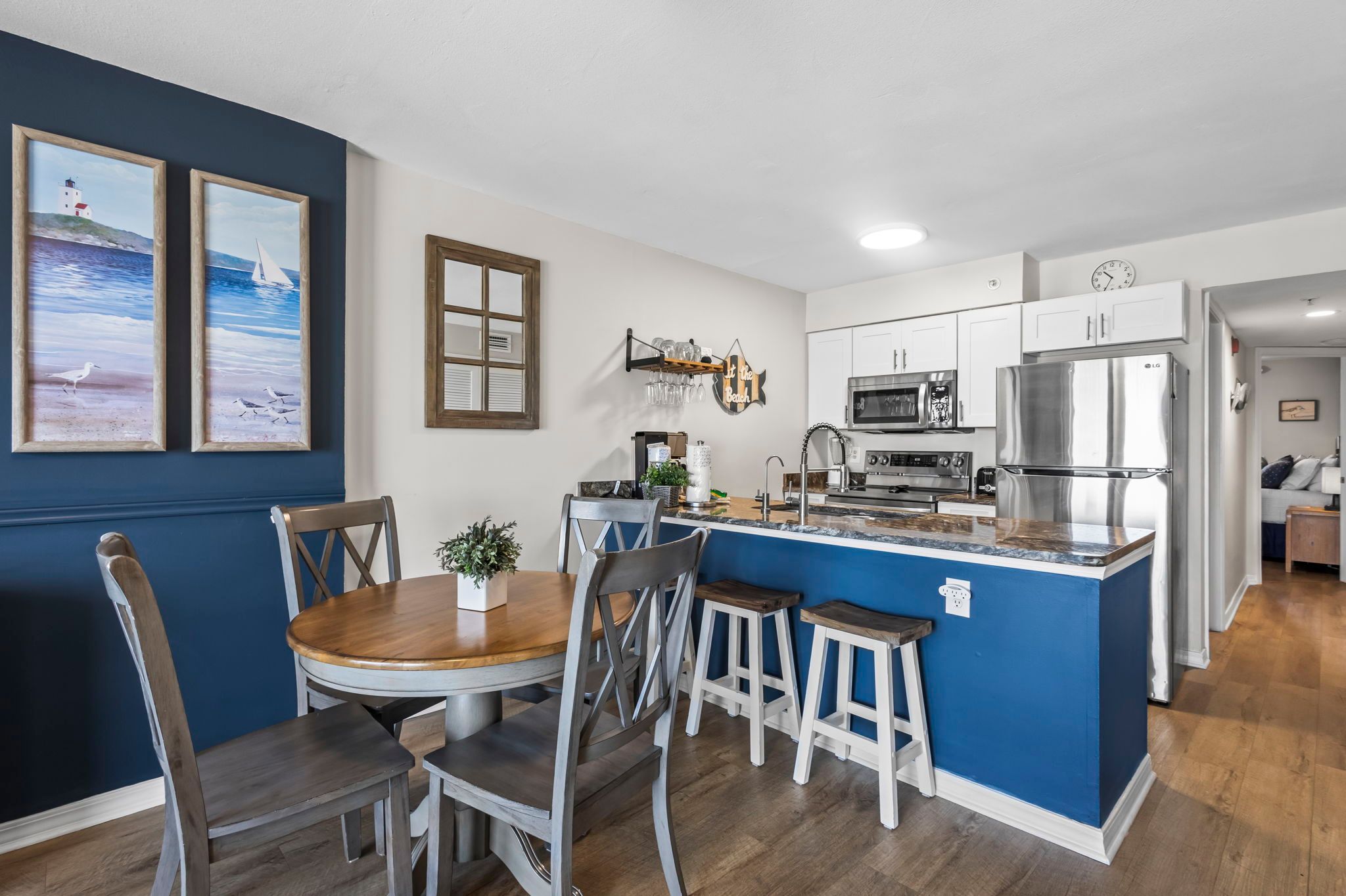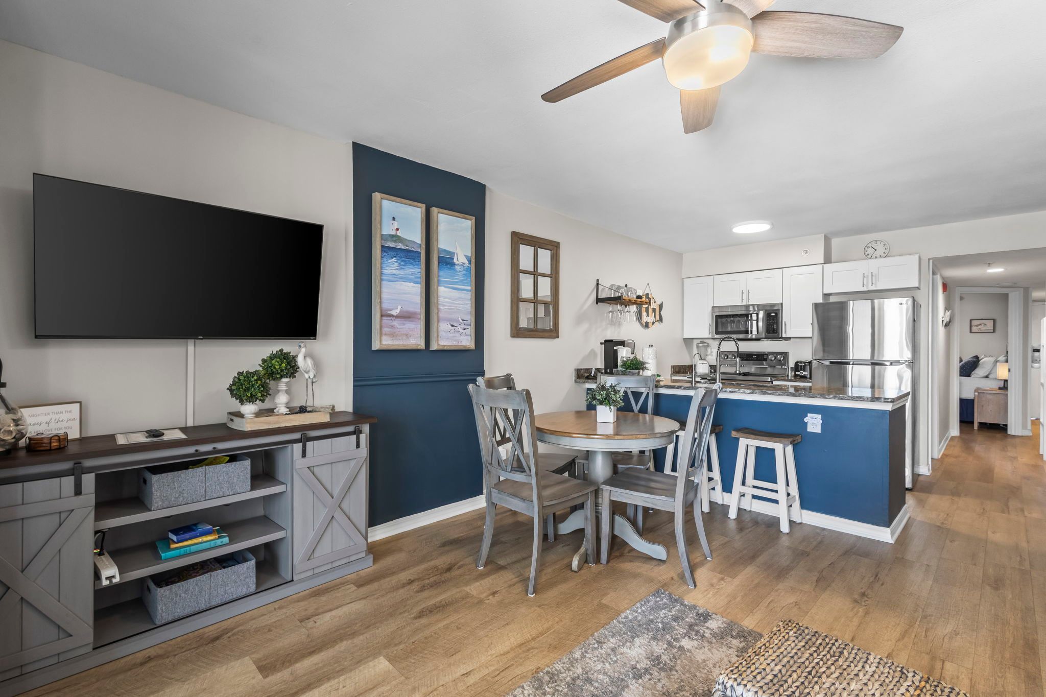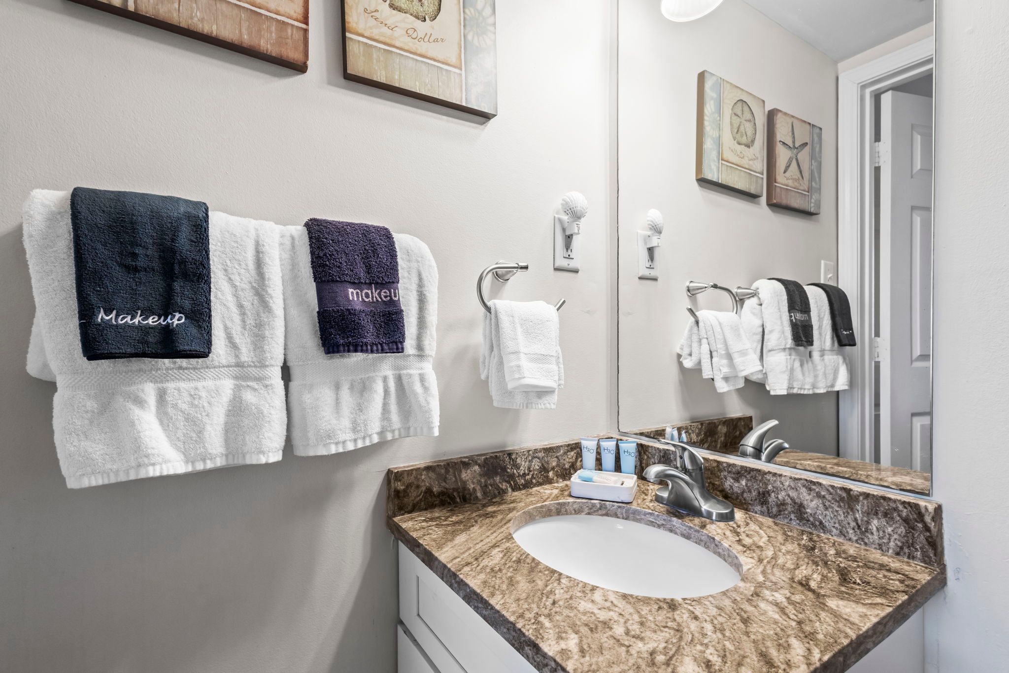 The unit has a beautiful seashore theme and is well stocked.