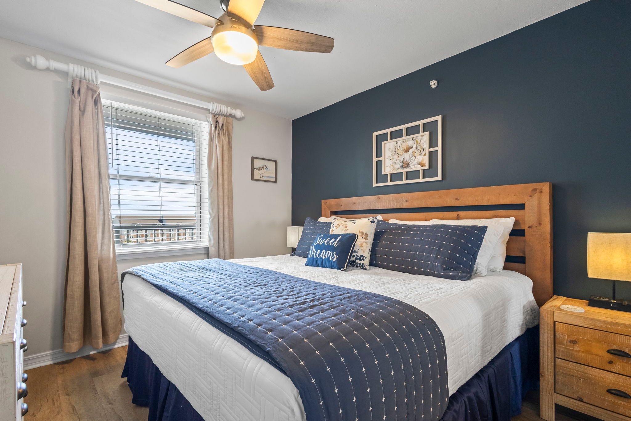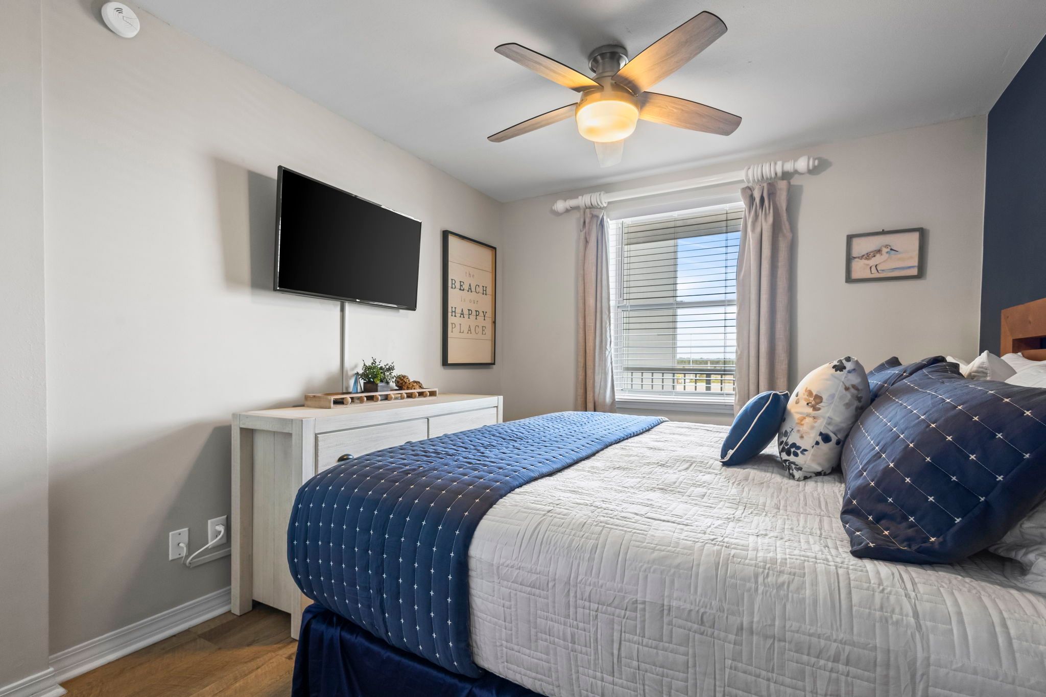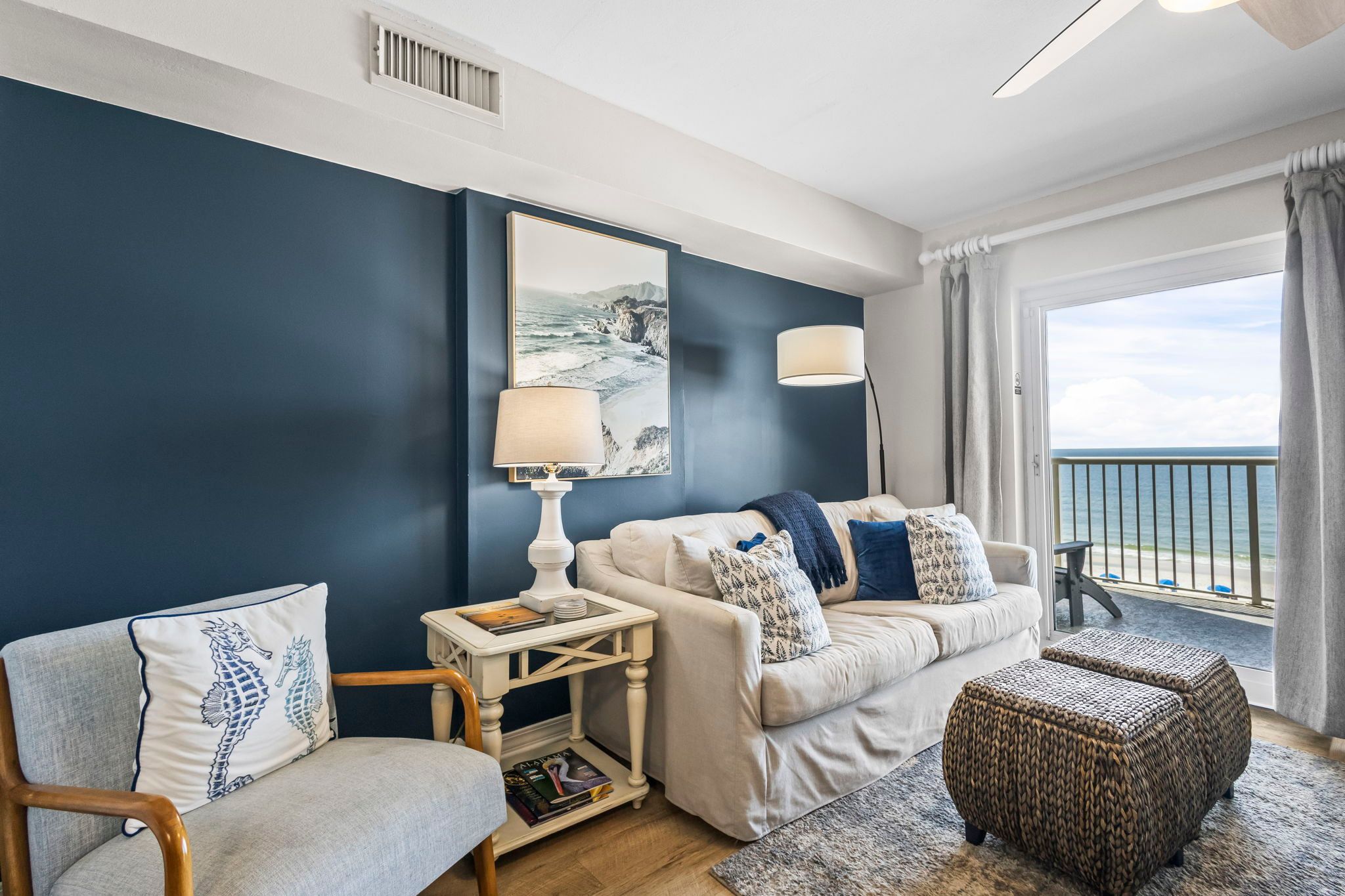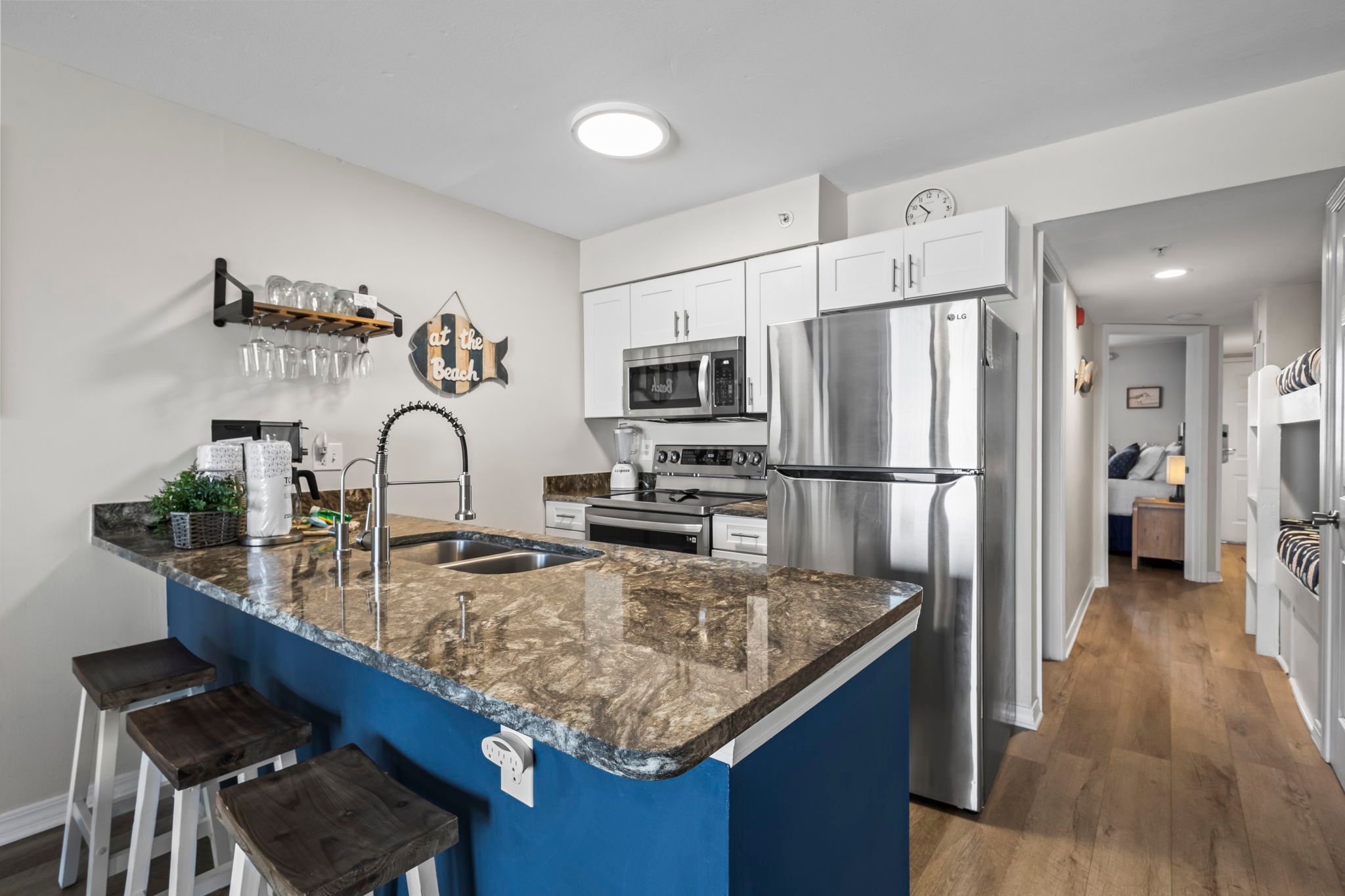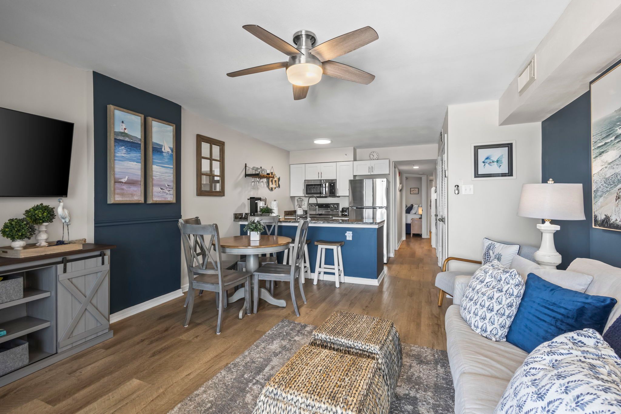 The unit has a beautiful seashore theme and is well stocked.