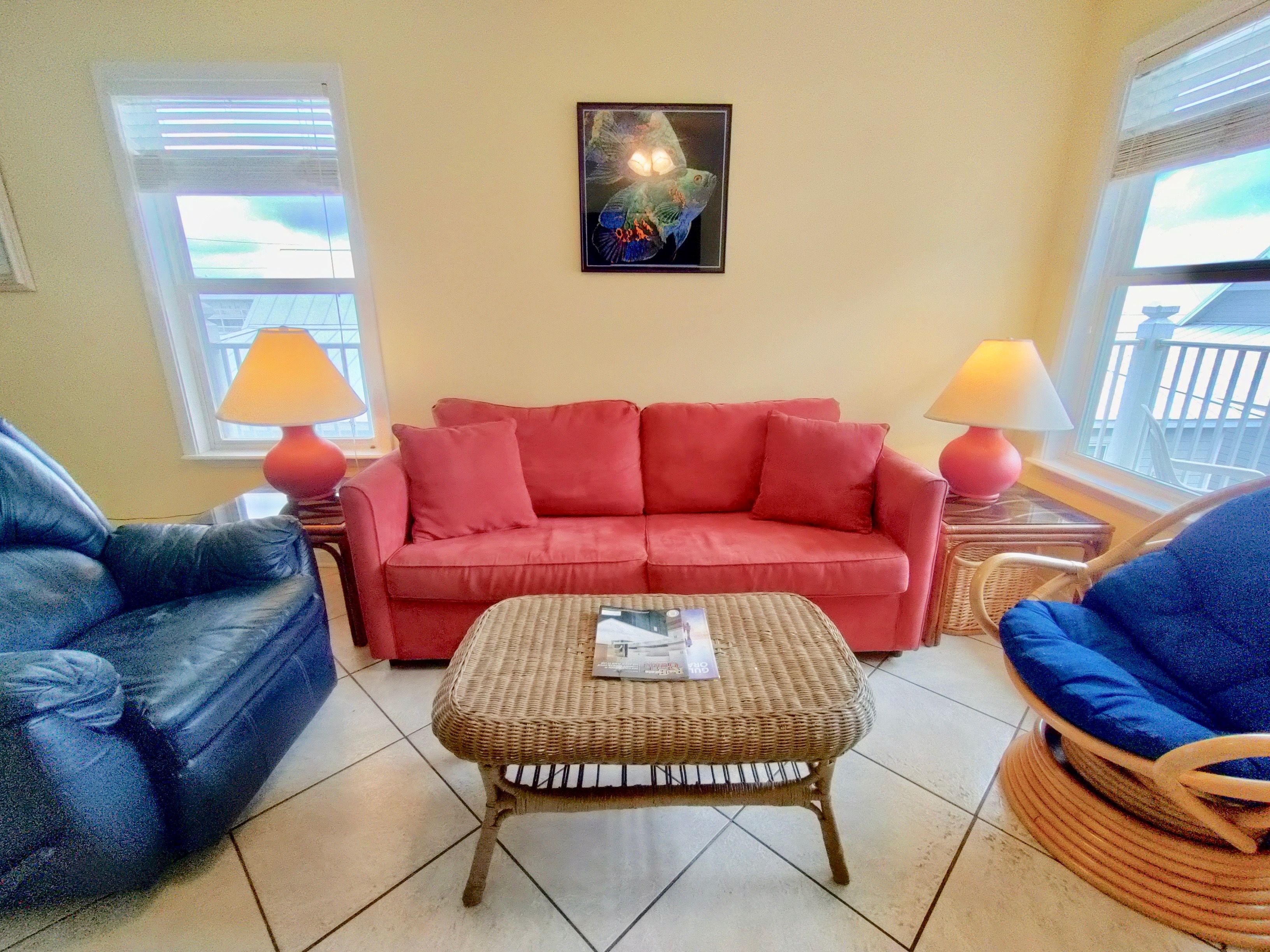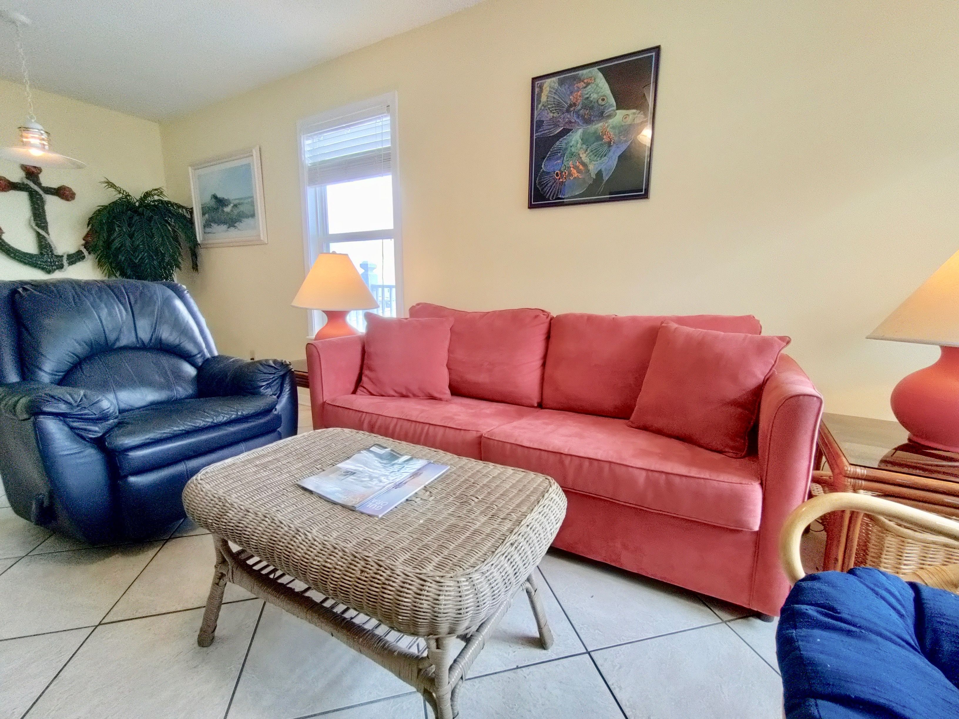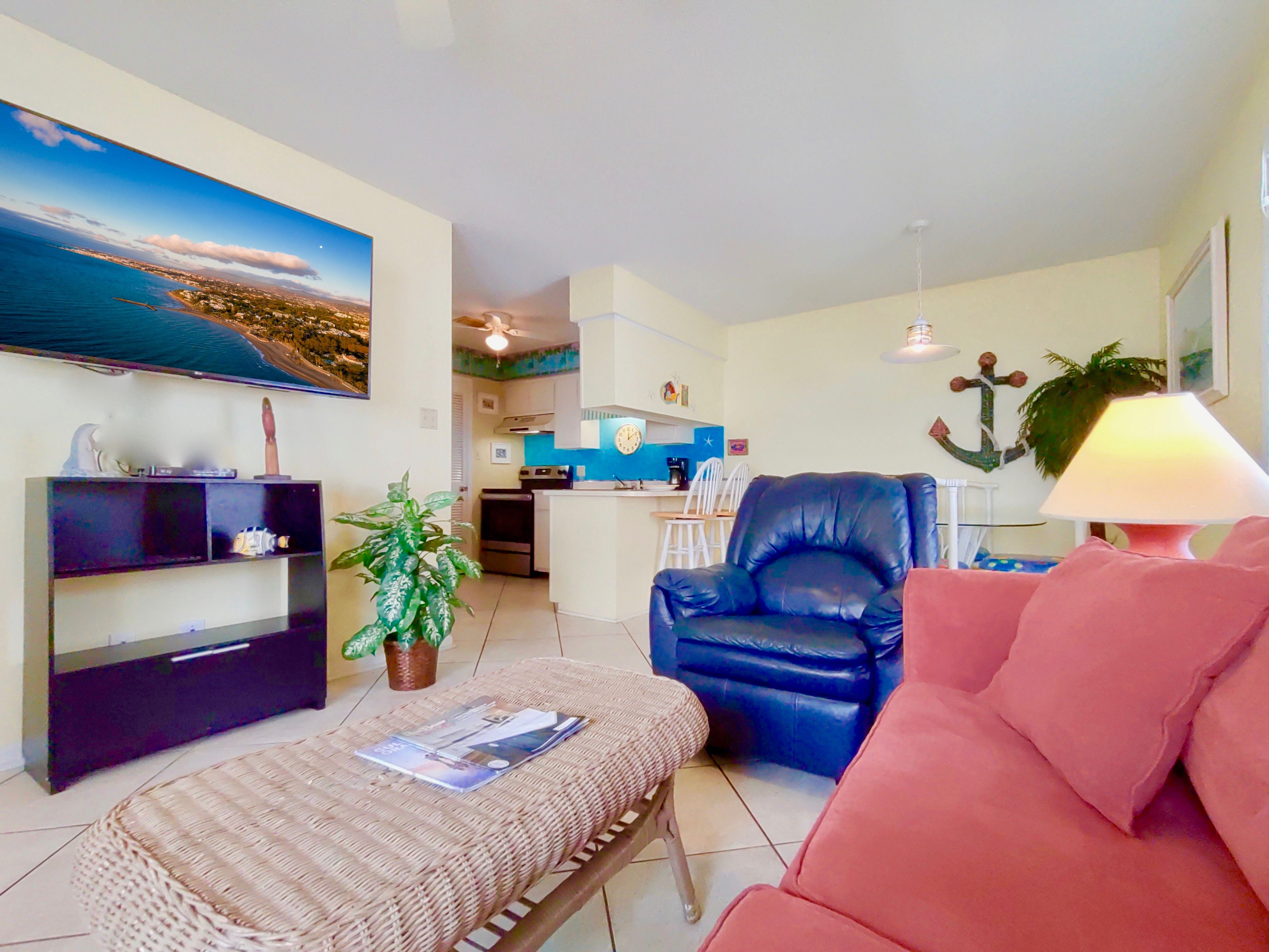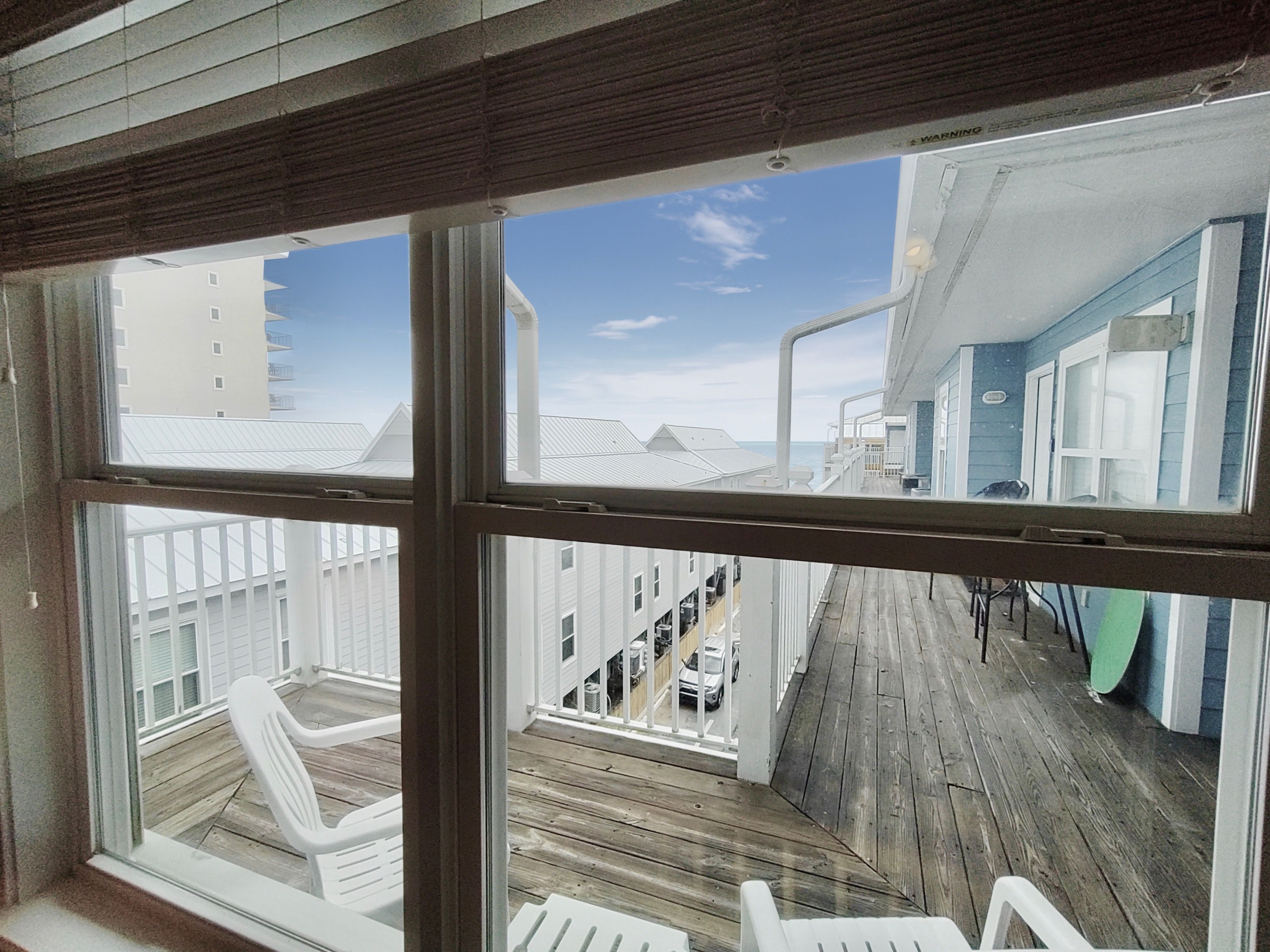 If you are looking for that economical stay, you have found the right one. This walk-up condo is located on the beach. The common area walkway has seating outside your front door. Take advantage of the side view of the Gulf or walk downstairs to relax and enjoy the beach. The outdoor swimming area and adjacent spa tub is quite nice. You will be near area restaurants, shopping and entertainment areas.