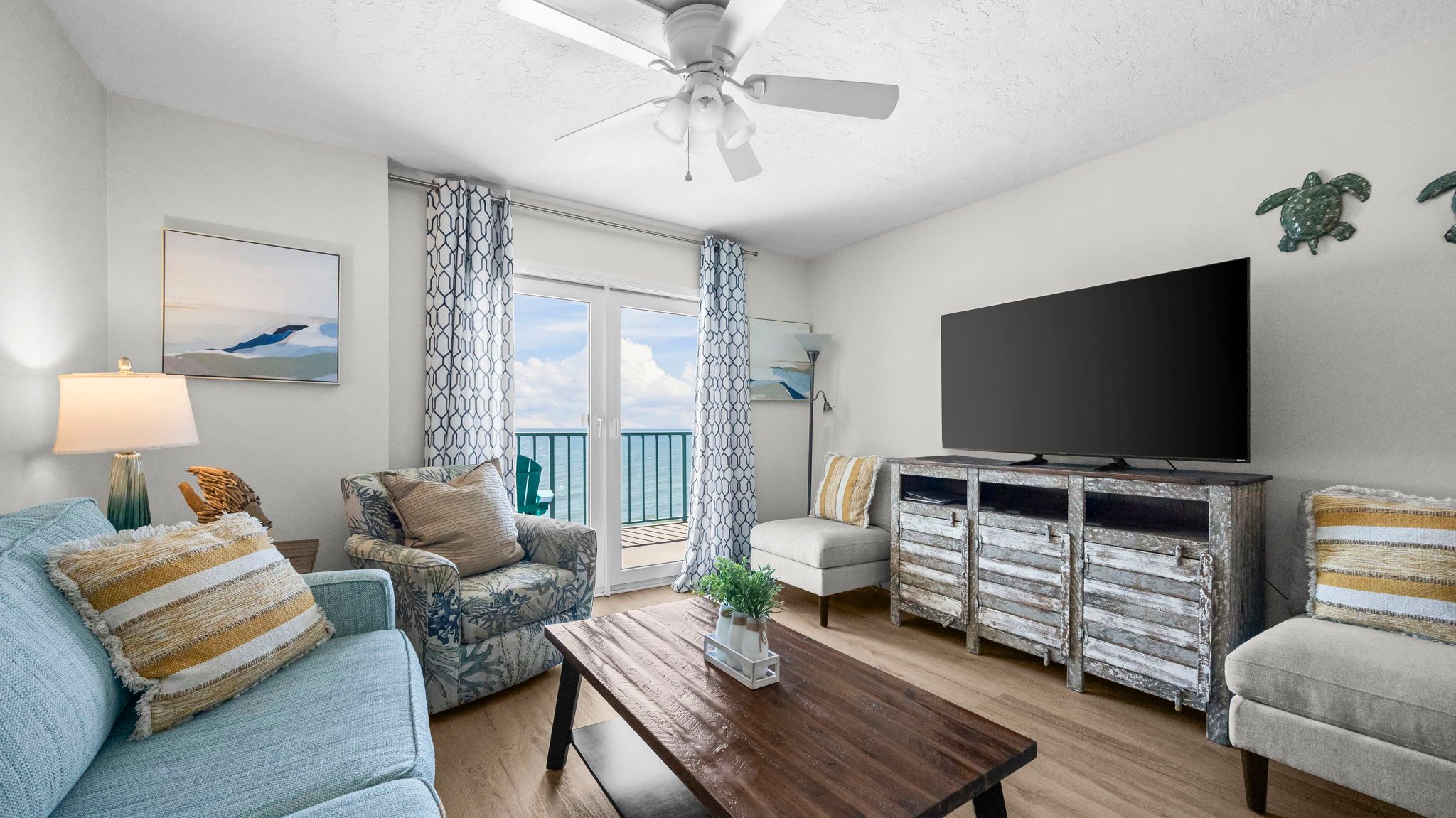 Surf Side Shores 1806 Spacious living area featuring plush seating, a large smart TV, and floor-to-ceiling windows that frame full Gulf views, ideal for family gatherings or quiet evenings.