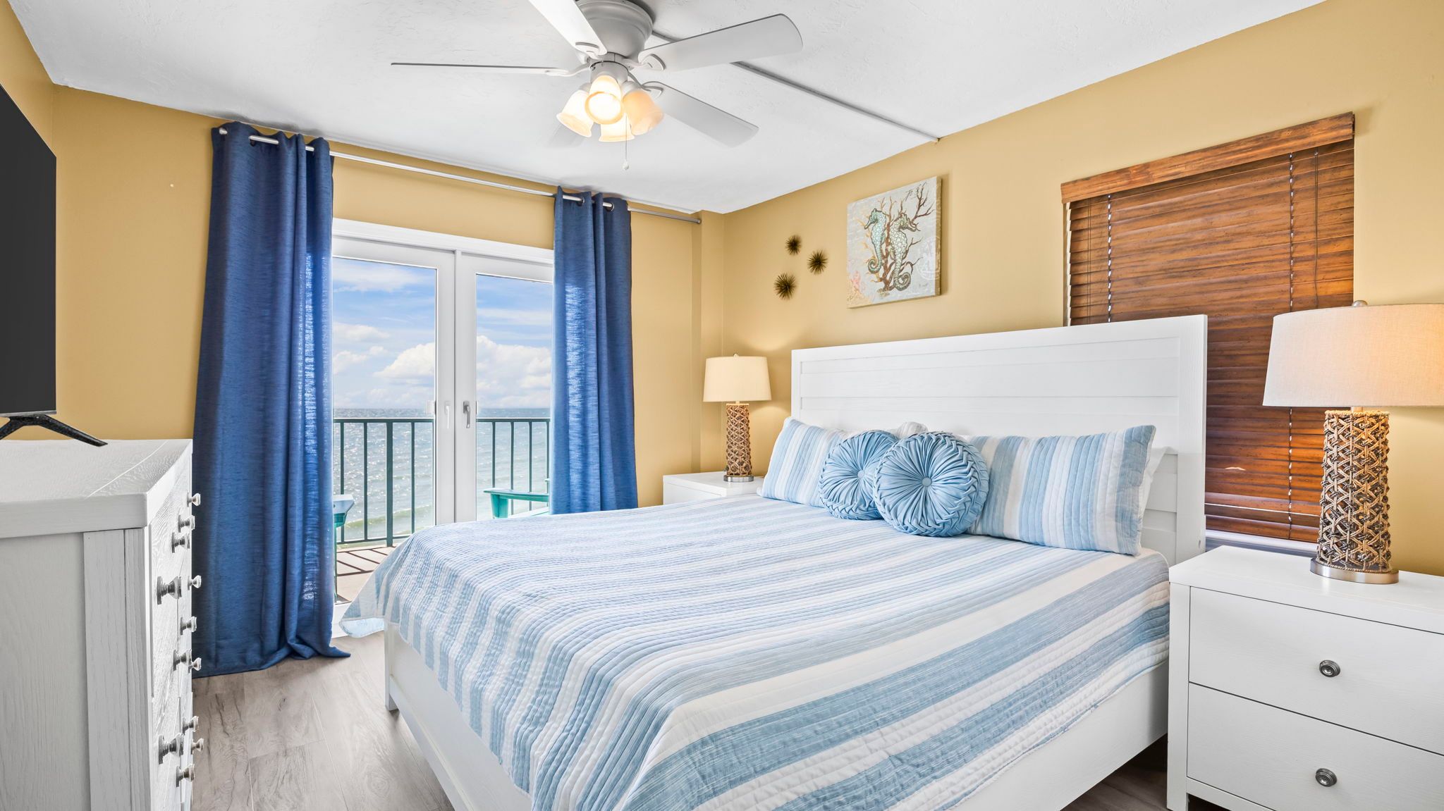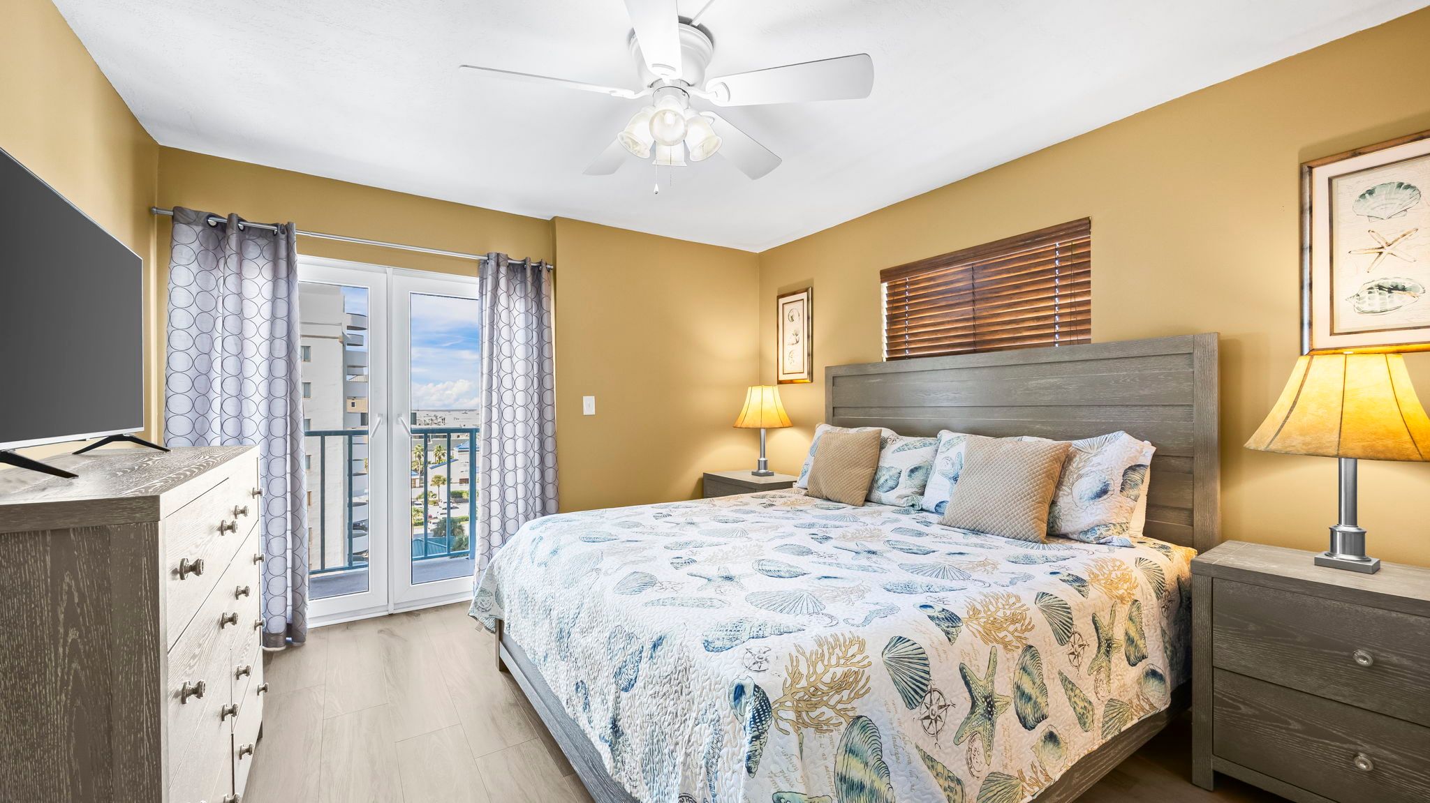 Surf Side Shores 1806 2nd Bedroom with King Bed, TV and Lagoon-facing balcony