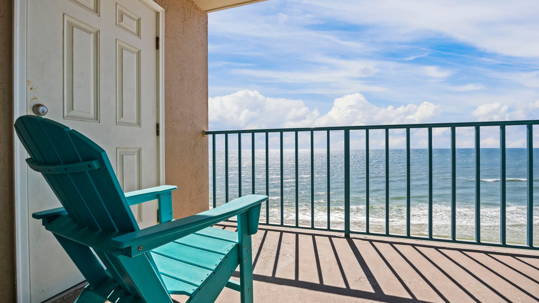 Surf Side Shores 1806 Balcony with panoramic Gulf views, offering a comfortable spot to enjoy your morning coffee or evening sunsets.