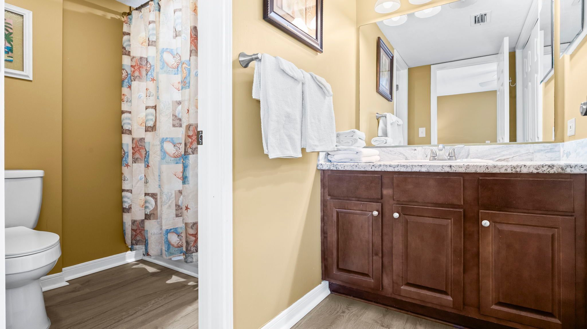 Surf Side Shores 1806 3rd Bathroom includes single vanity, shower and toilet.