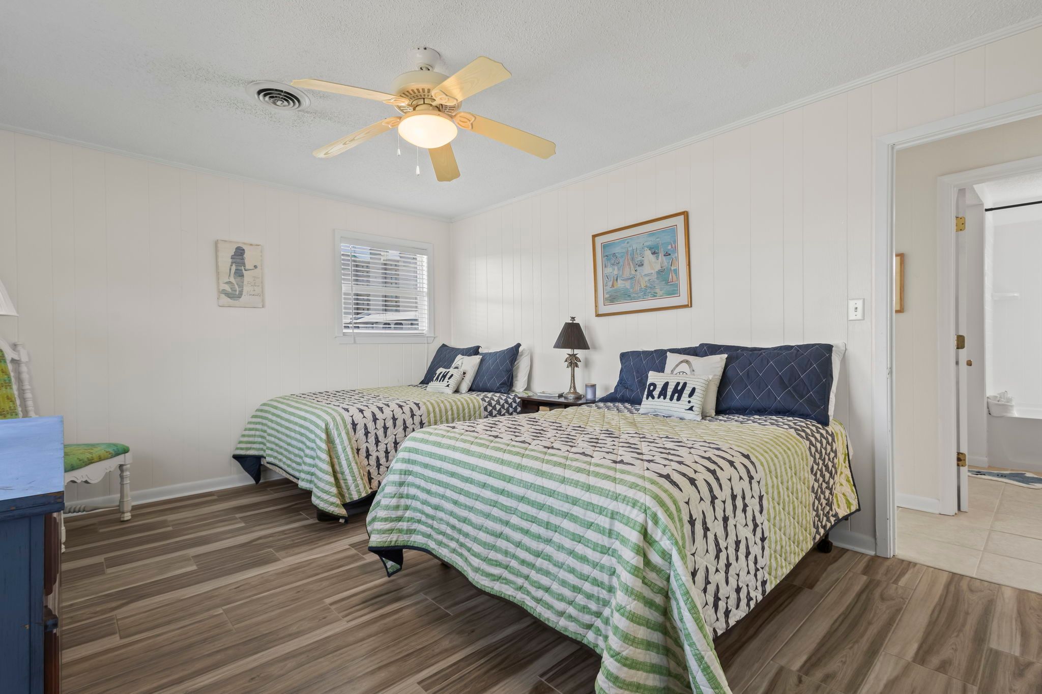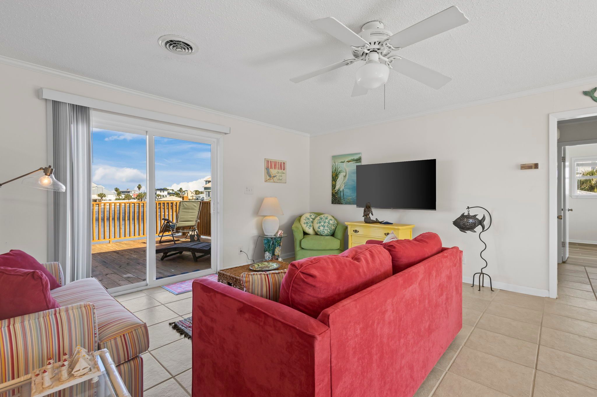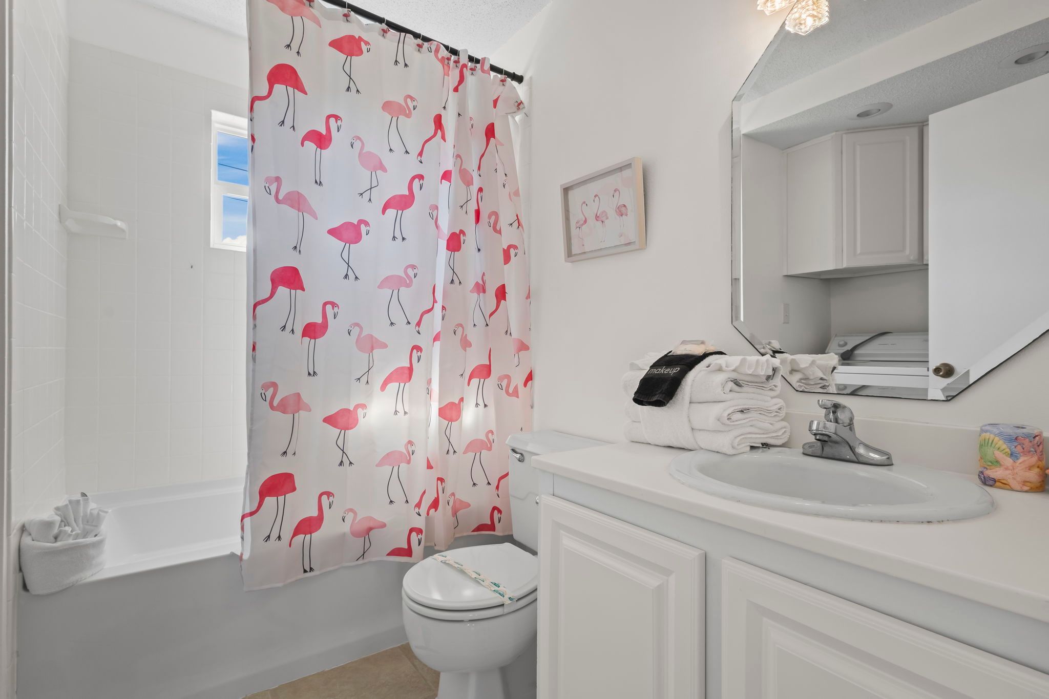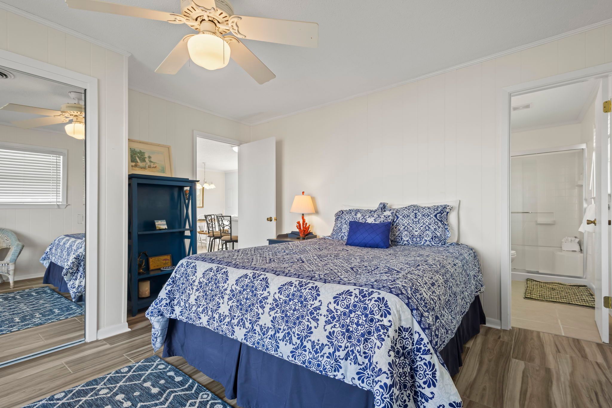Inside, the open living area makes you feel right at home, with cozy sofas and easy access to the deck for continued lagoon views. The dining area seats six, with additional seating in the eat-in kitchen, making mealtime a breeze. The kitchen is fully equipped with everything you need, including a microwave, toaster, Keurig, and refrigerator with ice maker. A washer and dryer add convenience during your stay. The primary bedroom features a queen-sized bed, private deck access, a TV, and an en-suite bathroom. The second bedroom has two full-sized beds, while the third bedroom has one full-sized bed, with both sharing a beautifully appointed bathroom.