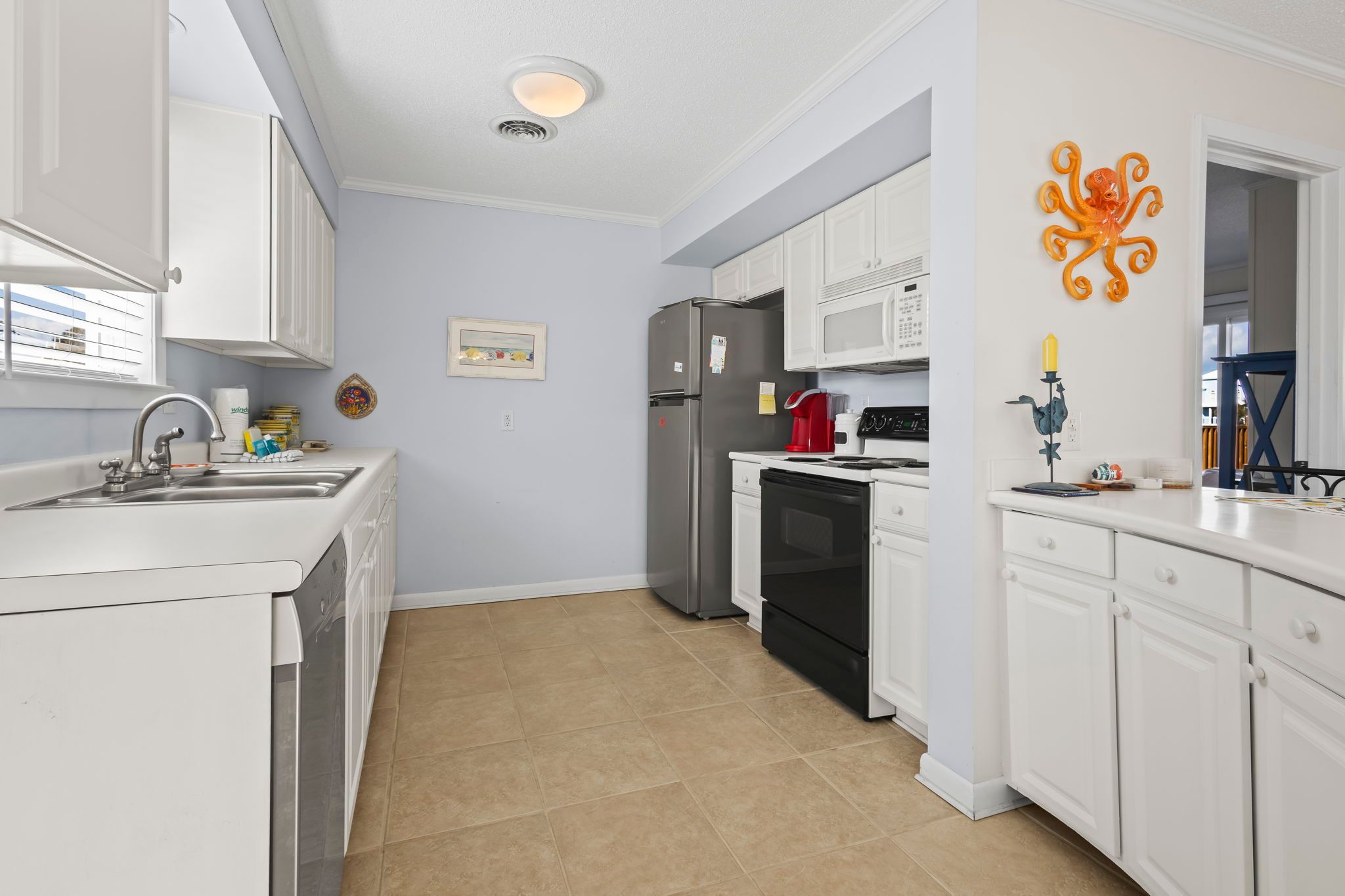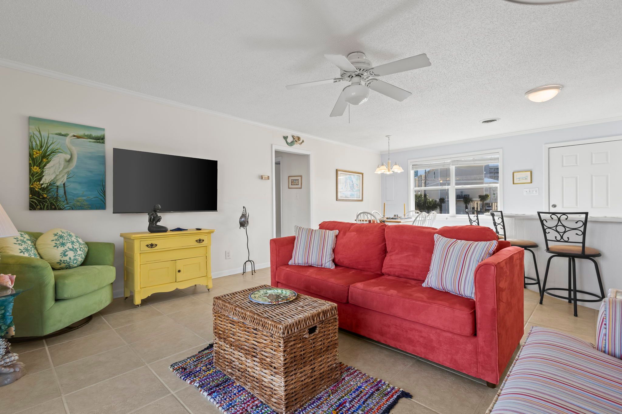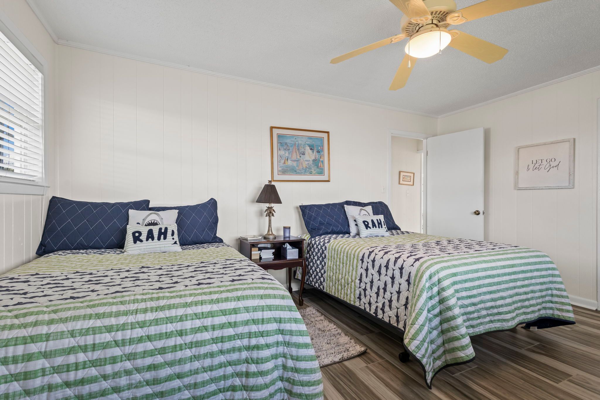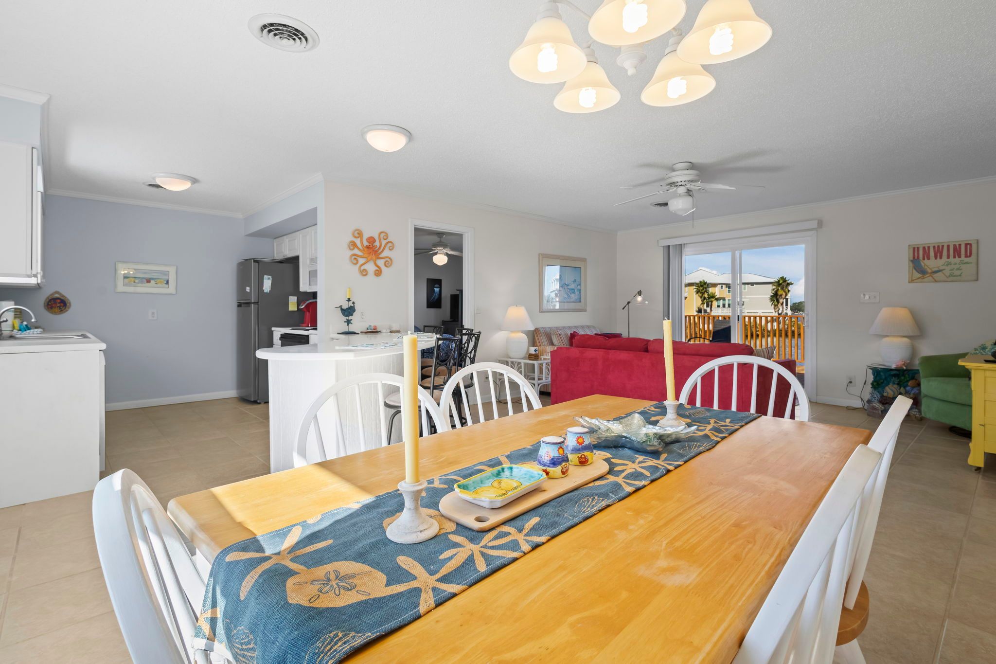 Inside, the open living area makes you feel right at home, with cozy sofas and easy access to the deck for continued lagoon views. The dining area seats six, with additional seating in the eat-in kitchen, making mealtime a breeze. The kitchen is fully equipped with everything you need, including a microwave, toaster, Keurig, and refrigerator with ice maker. A washer and dryer add convenience during your stay. The primary bedroom features a queen-sized bed, private deck access, a TV, and an en-suite bathroom. The second bedroom has two full-sized beds, while the third bedroom has one full-sized bed, with both sharing a beautifully appointed bathroom.
